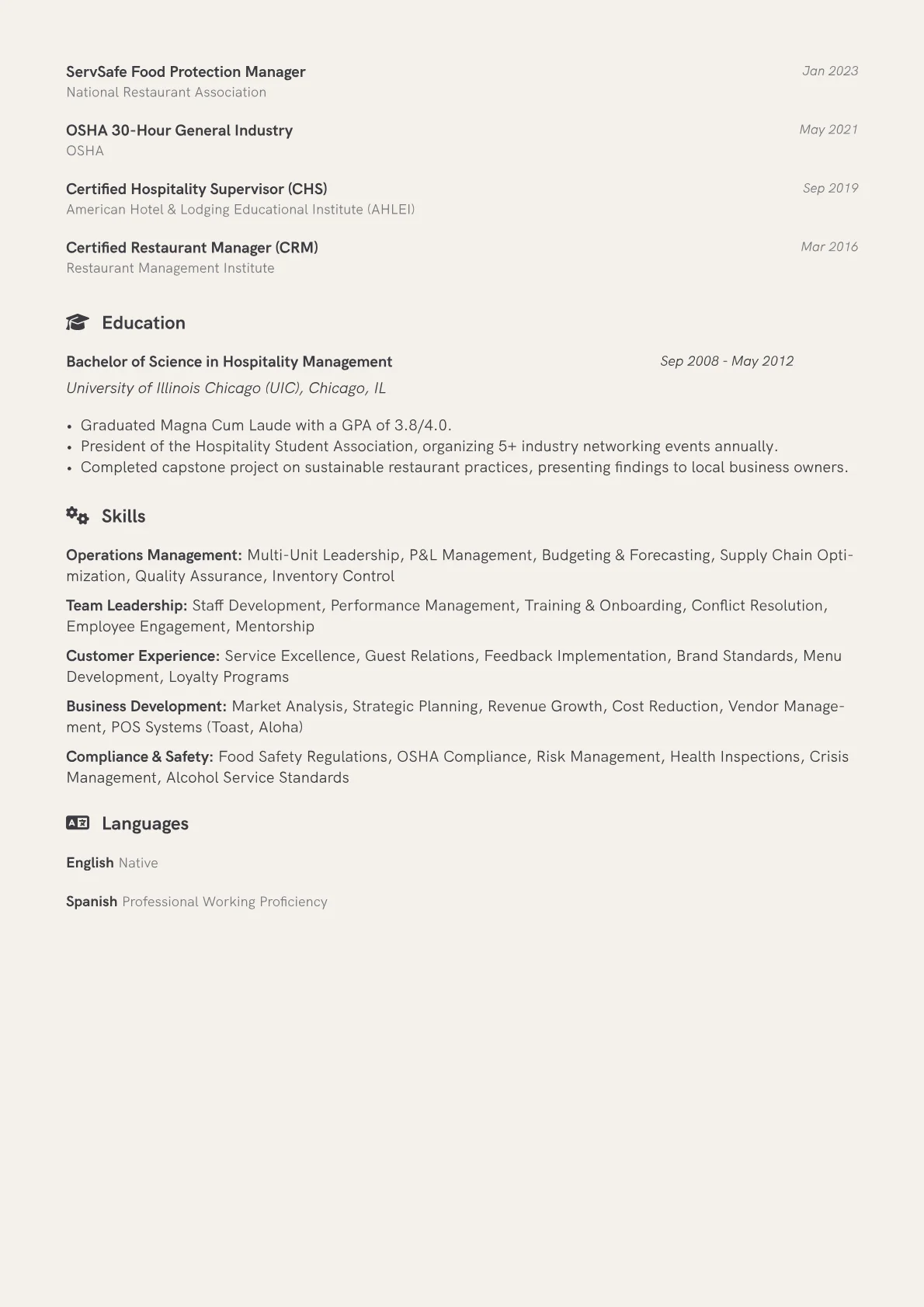 This example CV effectively highlights the necessary qualifications through its structured presentation. Achievements are clearly quantified, such as "Increased regional revenue by 18% across 7 units" or "Reduced food waste by 10% through new inventory controls." Skills are thoughtfully grouped into categories like "Multi-Unit Operations Management," "Financial Performance & P&L," and "Talent Development," immediately conveying breadth of expertise. Important certifications, including ServSafe Manager, and familiarity with industry-specific tools like major POS systems or Compeat inventory software, are prominently featured, assuring employers of technical proficiency.