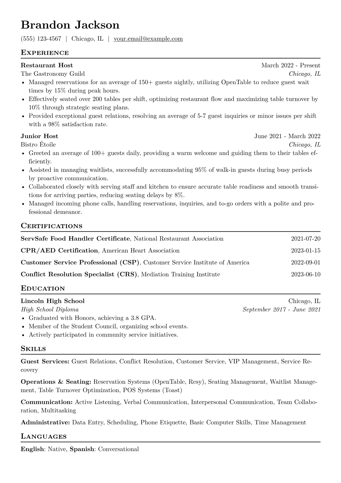 Crafting an effective Restaurant Host resume requires highlighting exceptional customer service, organizational prowess, and calm under pressure. Hiring managers seek candidates who make a memorable first impression, efficiently manage reservations and seating, and skillfully handle guest inquiries or issues, often in fast-paced environments. Demonstrating strong communication and problem-solving abilities is crucial for this pivotal front-of-house role.