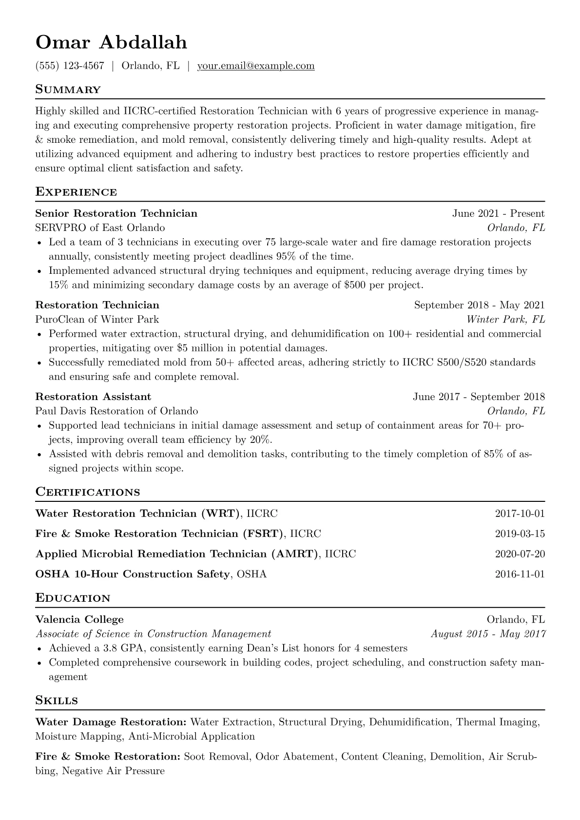 This template was built with JobSprout and can be remixed to create your own tailored Restoration Technician resume. Leverage its structure to highlight your unique experience and qualifications.