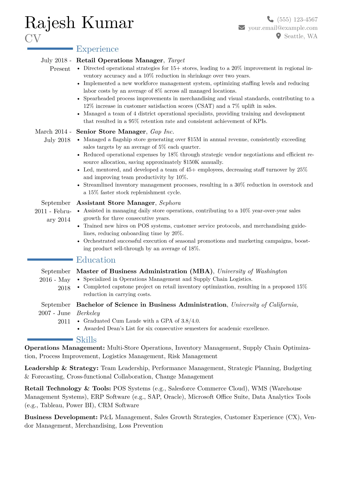 Hiring managers for senior Retail Operations roles seek proven leaders who drive efficiency and profitability across complex multi-channel environments. A strong resume clearly demonstrates expertise in supply chain optimization, inventory management, and enhancing the customer journey, often balancing brick-and-mortar with e-commerce demands. It must highlight the ability to streamline processes and implement data-driven strategies amidst the dynamic challenges of the retail landscape.