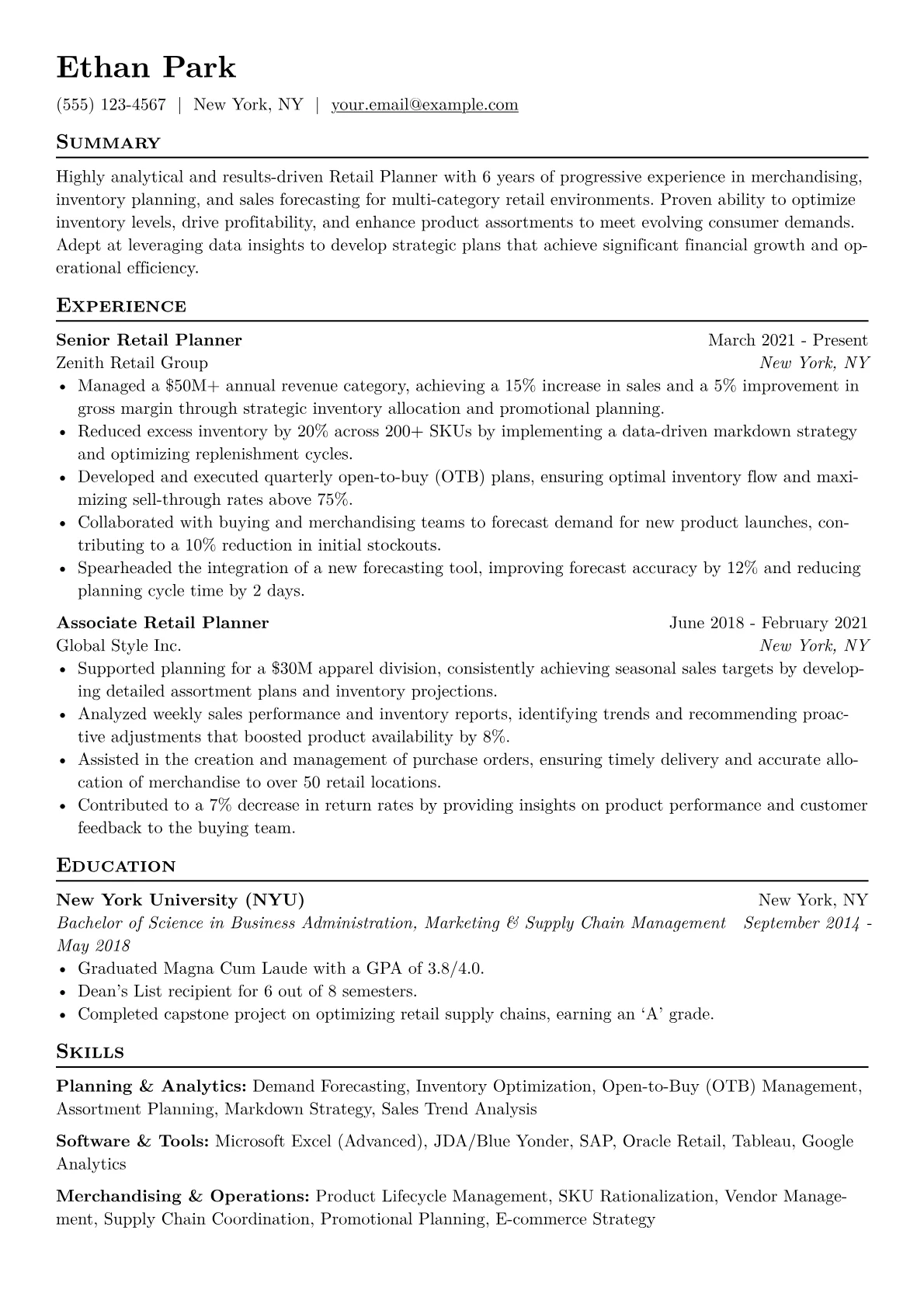 For a mid-level Retail Planner in the dynamic Retail & E-commerce sector, a strong resume highlights quantifiable impact on key operational metrics. Hiring managers specifically seek evidence of reduced overstock, improved sell-through rates, and precise demand planning across various channels. Concrete achievements should include optimizing inventory turnover, enhancing sales forecast accuracy, and effectively managing Open-to-Buy (OTB) for specific product categories. Mentioning proficiency in ERP systems like SAP or Oracle, along with BI tools such as Tableau or Power BI, is crucial, as is understanding concepts like SKU rationalization and replenishment strategies.