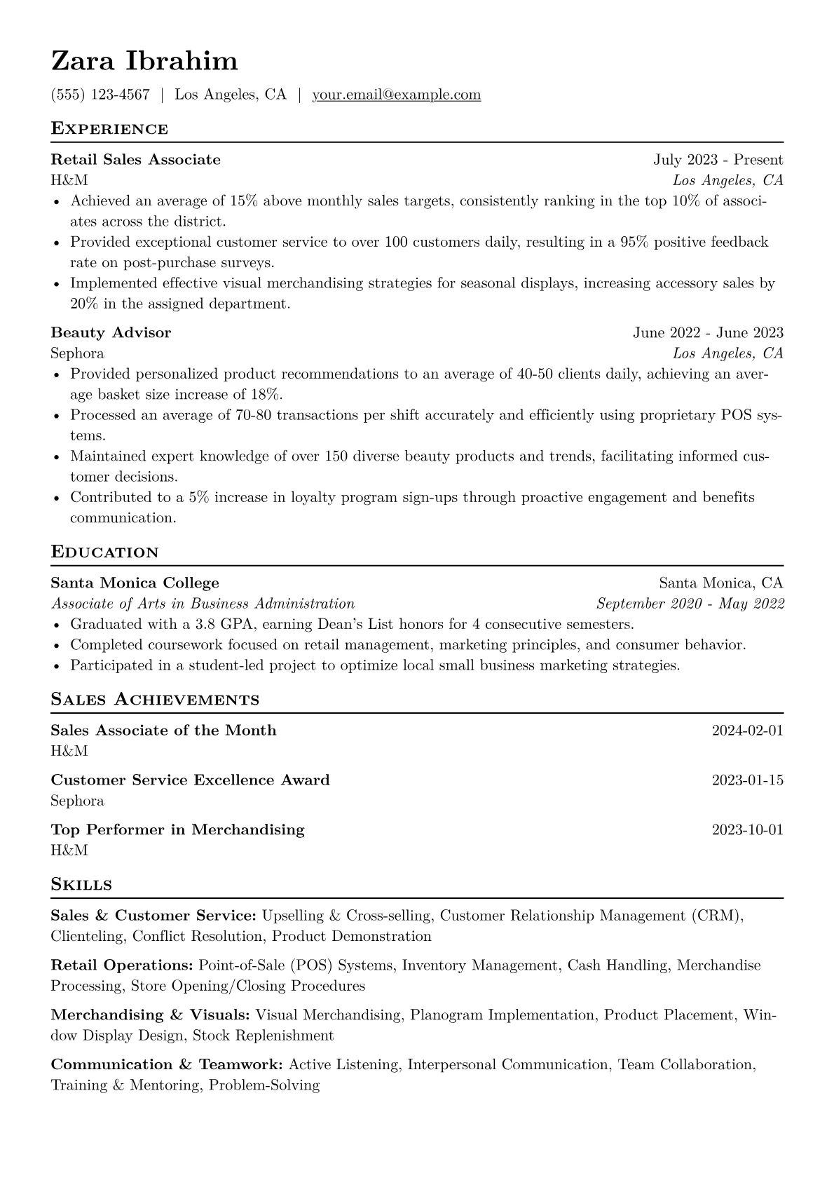 For a Retail Sales Associate, hiring managers in Retail & E-commerce prioritize candidates who demonstrate strong customer service, sales aptitude, and an understanding of retail operations. A successful entry-level resume highlights direct customer interaction, product knowledge, and the ability to contribute to sales targets, often navigating fast-paced or diverse retail environments. Clearly communicating a proactive, results-oriented approach is essential.
