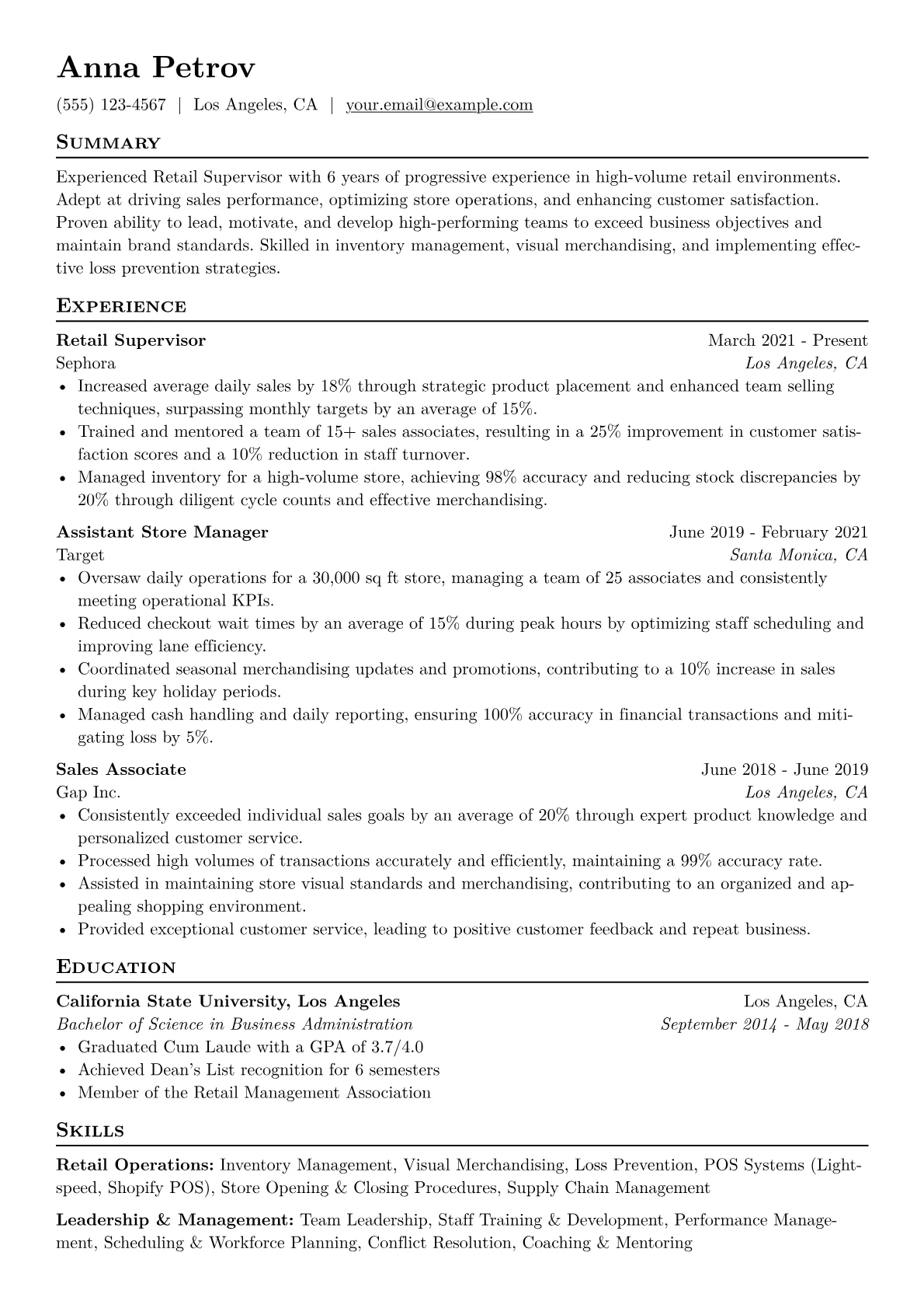 This template was built with JobSprout and can be remixed to create your own tailored Retail Supervisor resume, reflecting your unique experience and accomplishments.
