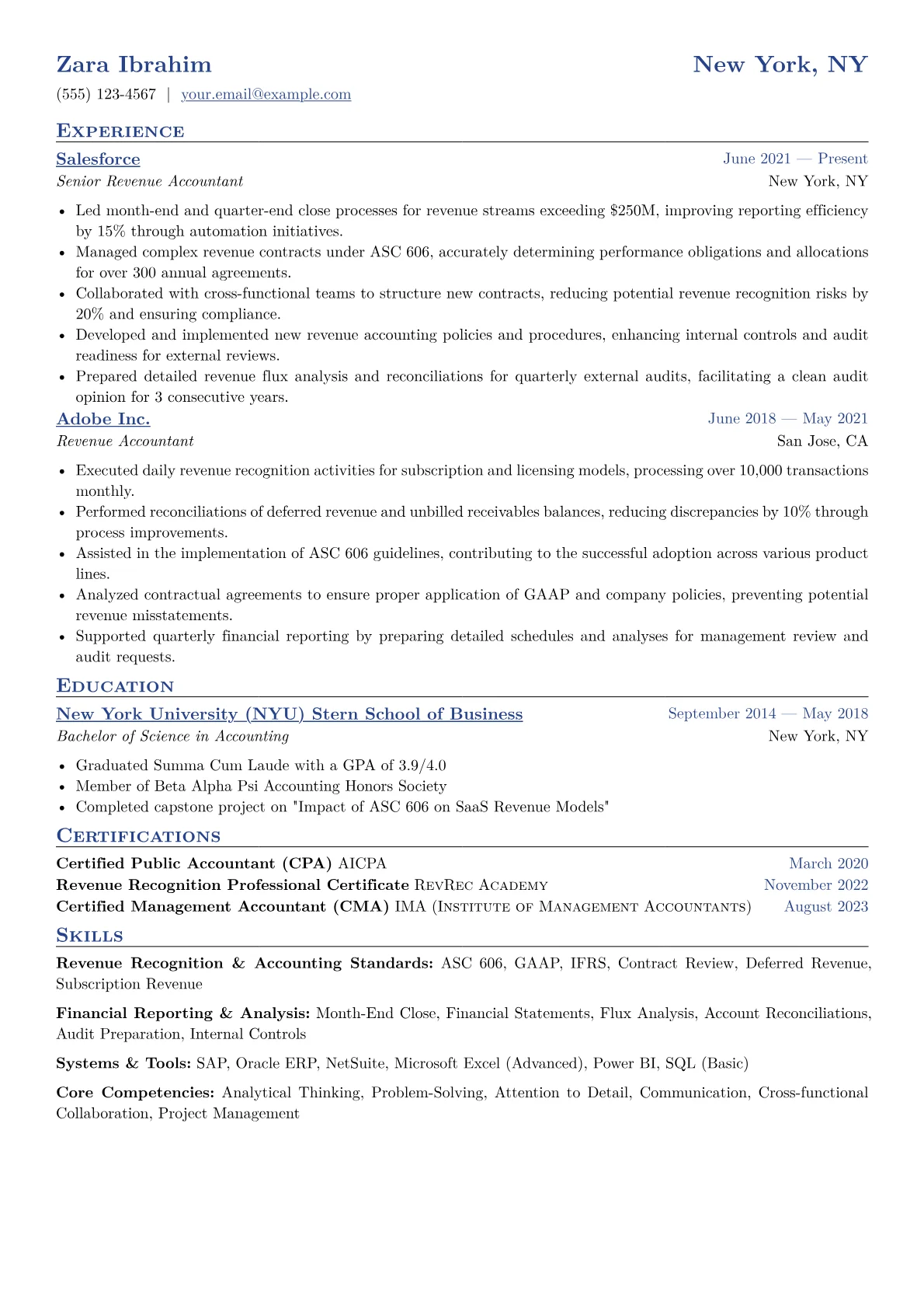 A strong Revenue Accountant resume for the Finance & Banking industry highlights precision, regulatory compliance, and system proficiency. Hiring managers seek candidates who demonstrate expertise in revenue recognition standards like ASC 606, general ledger reconciliation, and detailed financial reporting. The challenge is quantifying impact in a role focused on accuracy and process integrity, often involving complex revenue streams.