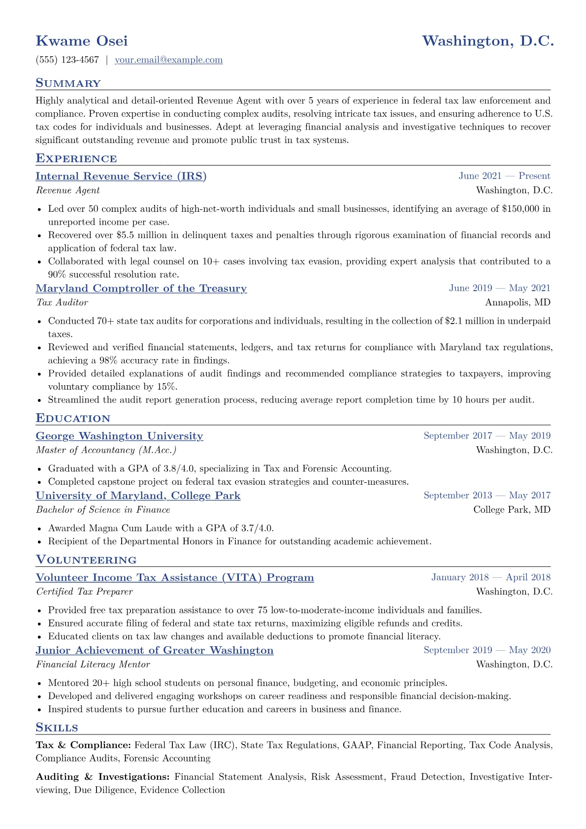 For a mid-level Revenue Agent in government, hiring managers prioritize demonstrated expertise in tax law application and financial investigation. Strong resumes highlight specific achievements in ensuring compliance with the Internal Revenue Code or state tax statutes. Look for quantifiable results such as identifying millions in underreported taxes, improving audit efficiency, or successfully resolving complex disputes. Deep knowledge of audit procedures, financial statement analysis, and relevant government regulatory frameworks is crucial. Terminology like tax gap analysis, enforcement actions, and dispute resolution processes should be prominent.