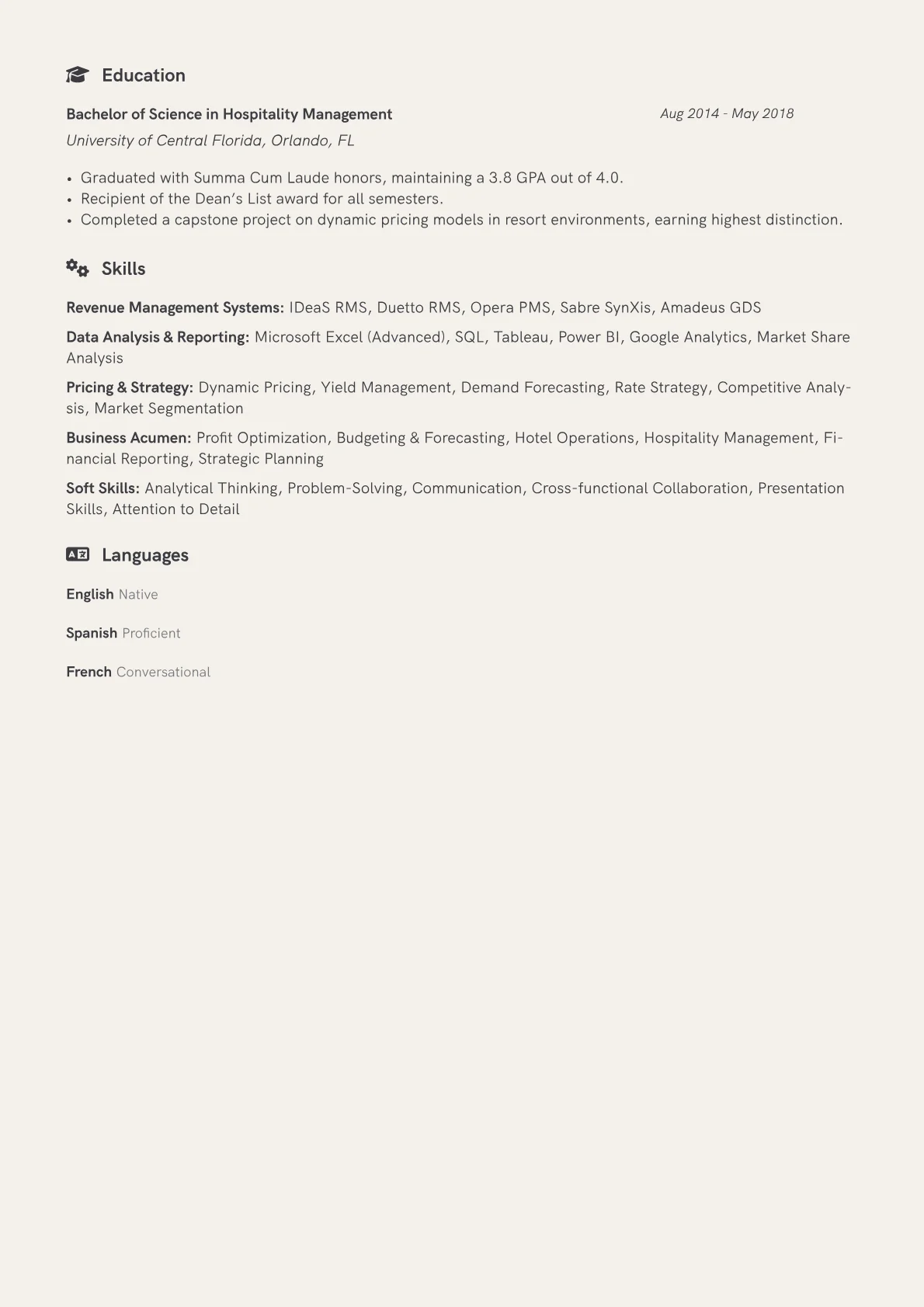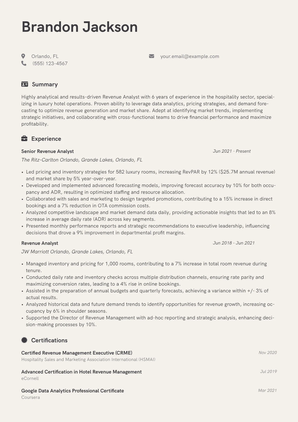 This template was built with JobSprout and can be remixed to create your own tailored Revenue Analyst Hotel resume.