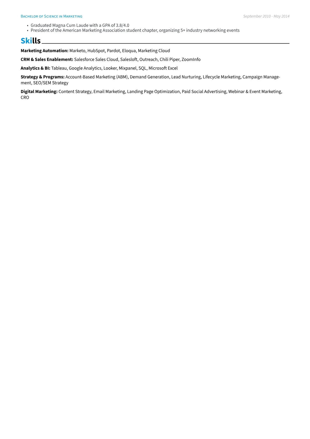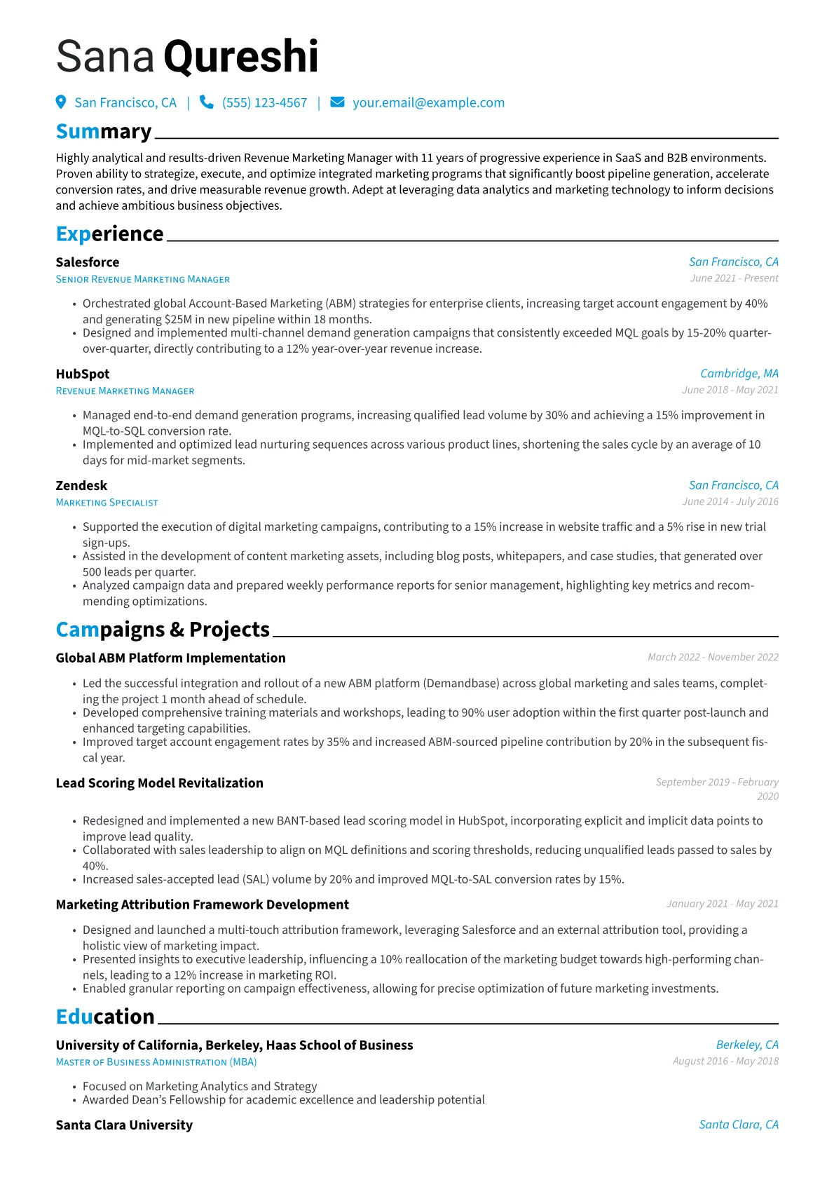 The JobSprout example resume effectively highlights these critical elements for a Revenue Marketing Manager. It strategically groups technical proficiencies, showcasing command of platforms vital for revenue generation rather than simply listing them. Achievements are meticulously quantified, illustrating direct financial outcomes such as "increased pipeline contribution by 25% through targeted ABM strategies" or "reduced customer acquisition cost by 15% via optimized multi-channel campaigns." The resume emphasizes outcomes over activities, a crucial distinction for senior marketing leadership.