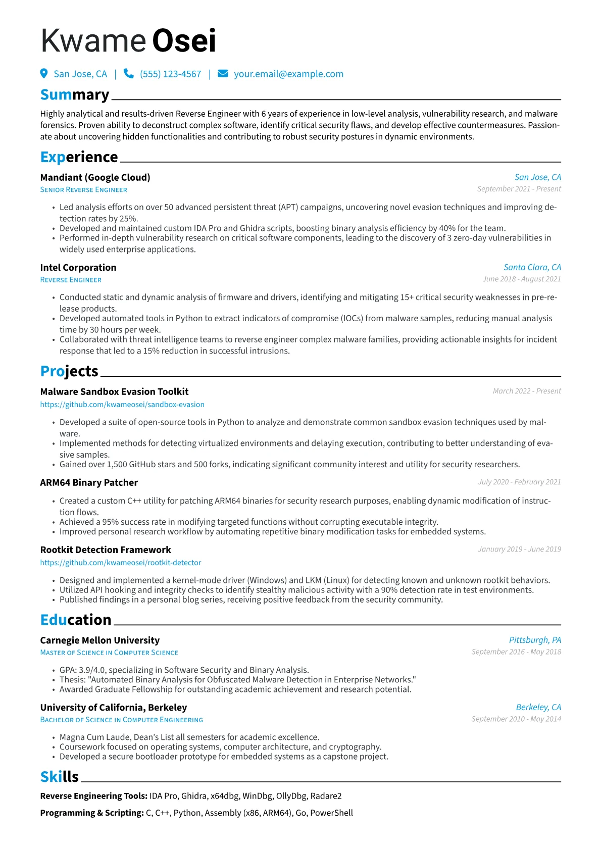 The JobSprout Reverse Engineer example effectively structures these critical elements. It quantifies achievements by detailing specific vulnerabilities identified and their impact, for instance, "Deciphered obfuscated malware, reducing incident response time by 25%." Skills are clearly grouped, separating programming languages like C/C++ and Python from specialized tools (e.g., Wireshark, OllyDbg) and methodologies (e.g., kernel debugging, static/dynamic analysis). Key certifications and relevant academic projects are prominently highlighted, assuring hiring managers of the candidate's technical depth and practical application.