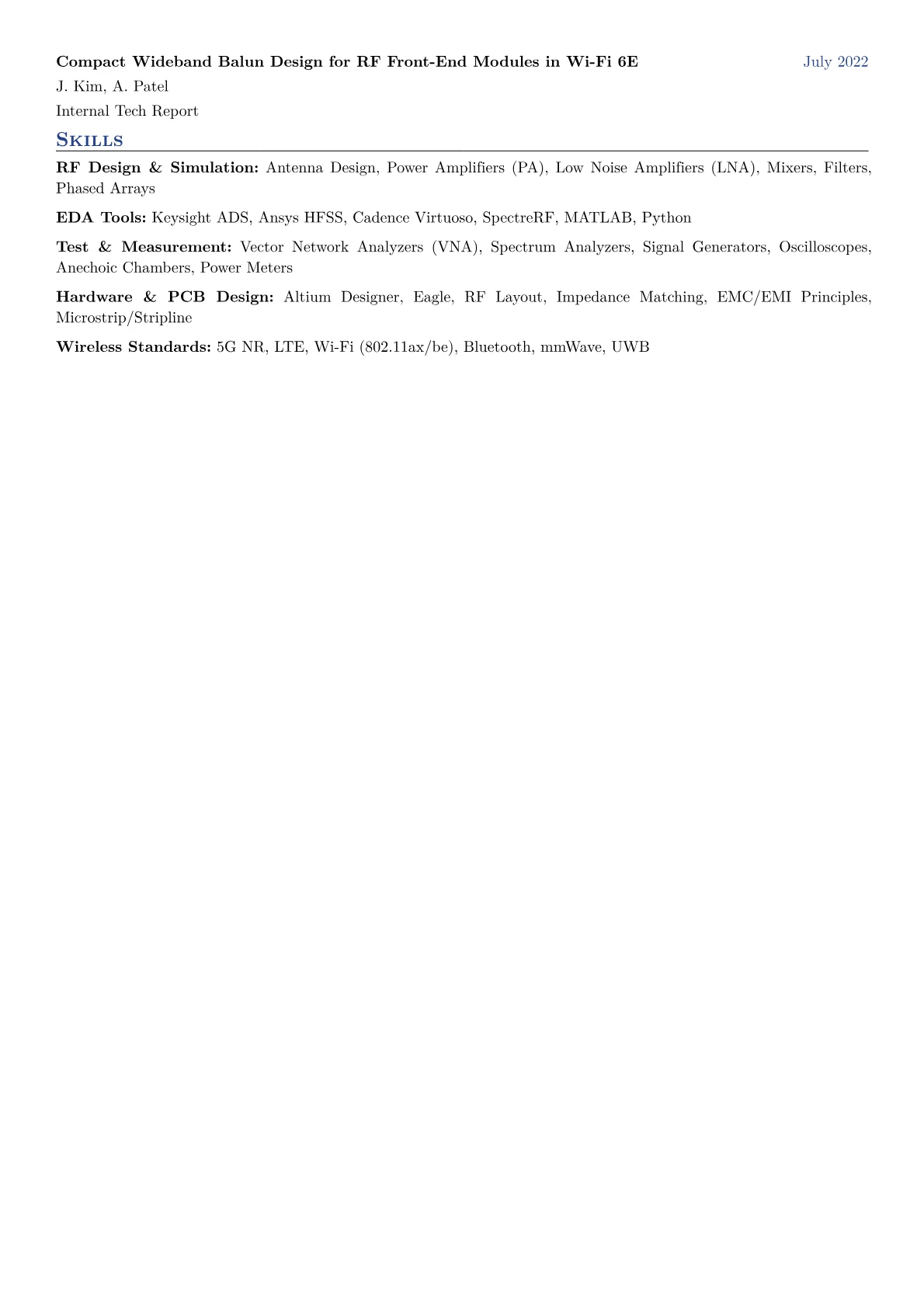 The JobSprout RF Engineer example resume effectively showcases these critical elements. It quantifies achievements like "Reduced signal loss by 15% across XYZ product line" or "Decreased manufacturing defects related to RF performance by 10%." Skills are intelligently grouped, separating RF simulation tools (HFSS, ADS) from test equipment (VNA, spectrum analyzer) and programming languages (Python for test automation). Vital certifications, such as specific ISO quality standards or expertise with specialized RF test beds, are prominently highlighted, making it easy for recruiters to identify relevant qualifications for high-volume production settings.