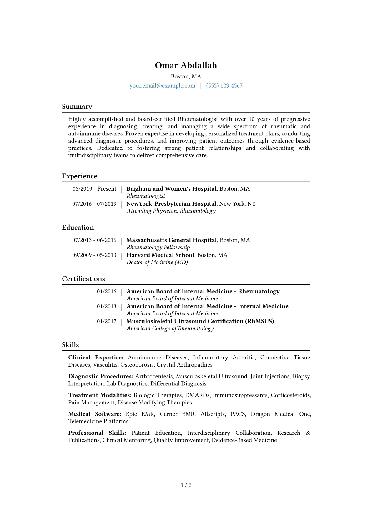 This example CV excels by quantifying achievements effectively; for instance, detailing the management of a patient panel exceeding 1,200 unique cases or leading a research initiative that contributed to three peer-reviewed publications. Skills are logically grouped into categories like "Clinical Procedures" (e.g., joint aspirations, intra-articular injections), "Diagnostic Modalities" (e.g., MSK ultrasound interpretation), and "EMR Proficiency." Crucial certifications, including ABIM Rheumatology Board Certification, are prominently displayed, immediately conveying advanced qualifications and specialized knowledge to prospective employers.