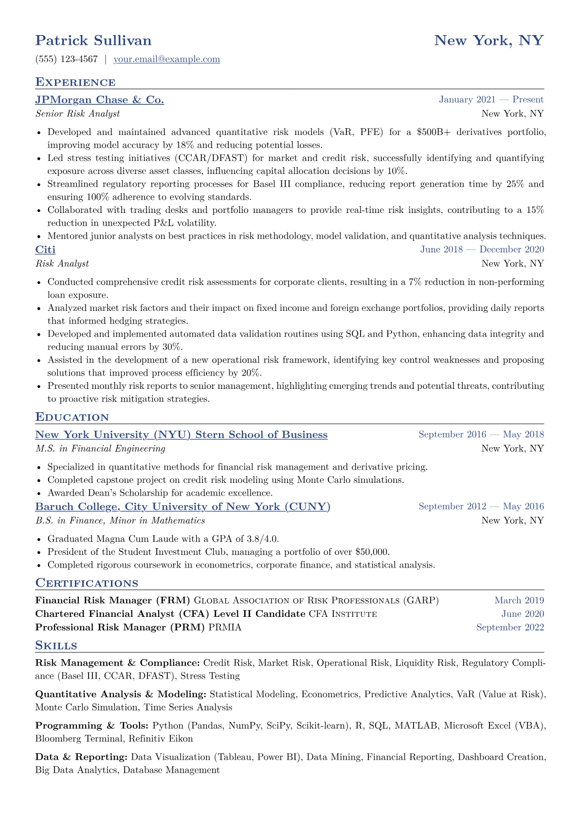 This example effectively highlights those critical elements through its structure, featuring clearly quantified achievements that illustrate value added, such as specific percentages of loss reduction or portfolio size managed. Grouping relevant technical skills like SQL, Python, and specific risk methodologies, alongside certifications like FRM or CFA, immediately signals industry-specific expertise.