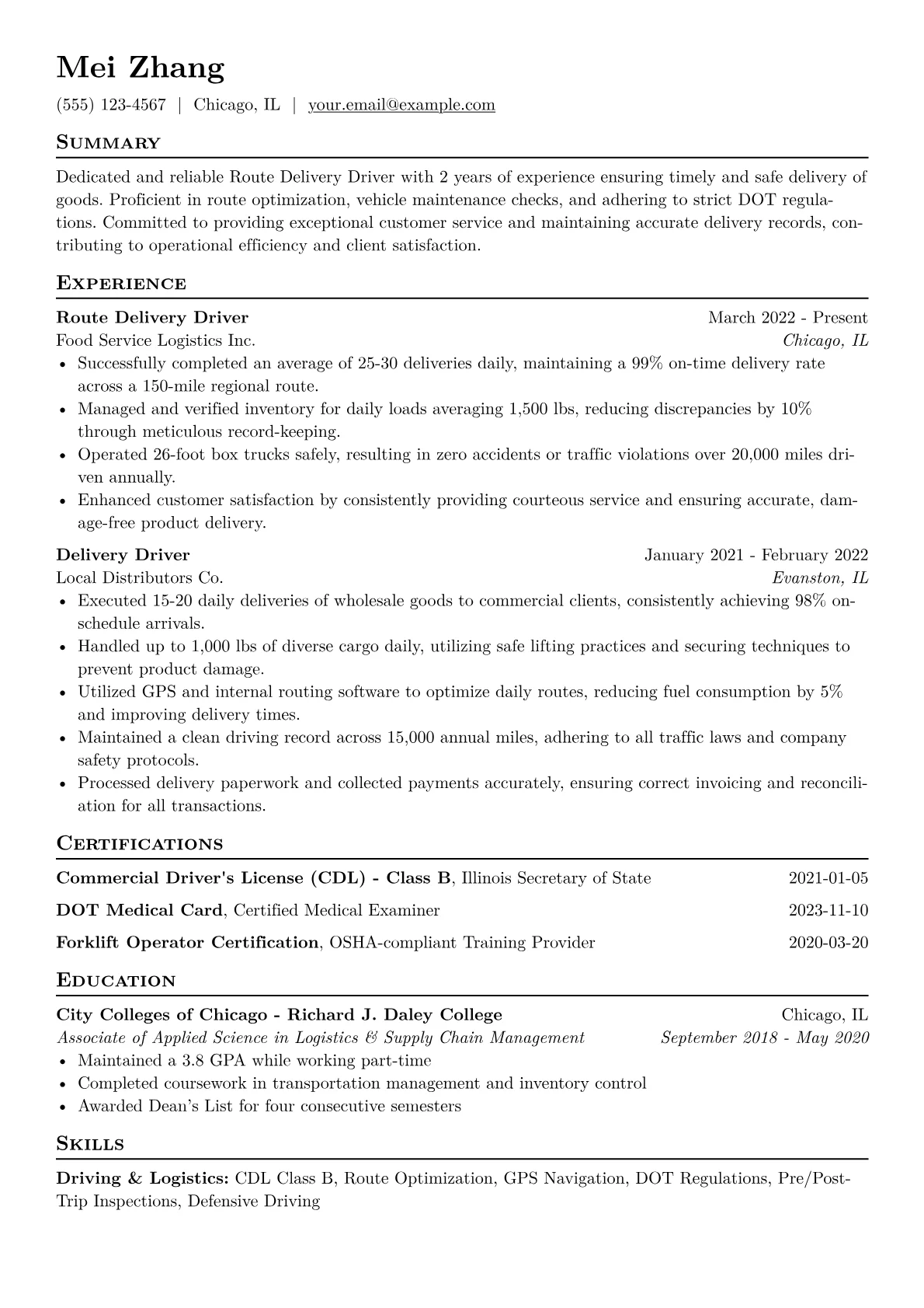 For an entry level Route Delivery Driver in the "Other" industry, hiring managers prioritize reliability, efficiency, and a commitment to safety. They seek candidates who can demonstrate a clean driving record, punctuality, and the ability to manage a demanding schedule. Concrete achievements involve consistent on time delivery rates, successful pre trip vehicle inspections, and accurate inventory handling. Highlighting any defensive driving certifications, a current DOT medical card if relevant, or proficiency with common route optimization software and handheld scanners are key indicators of job readiness.