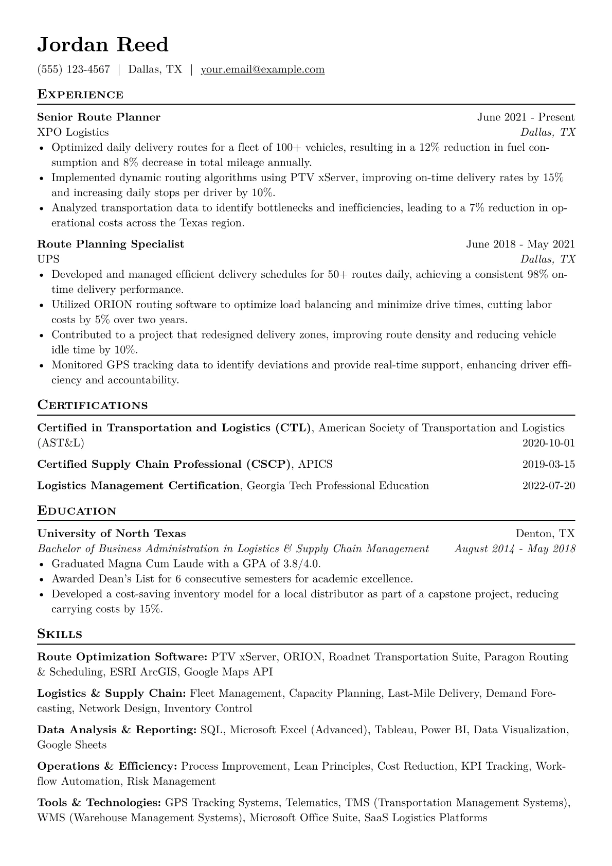 A strong Route Planner resume in the "Other" operations sector emphasizes strategic thinking and tangible results. Hiring managers seek candidates who can optimize complex logistics, reduce operational costs, and enhance delivery efficiency across diverse, non-traditional fleets. The unique challenge lies in demonstrating adaptability and problem-solving skills for varied operational demands beyond typical trucking or package delivery.