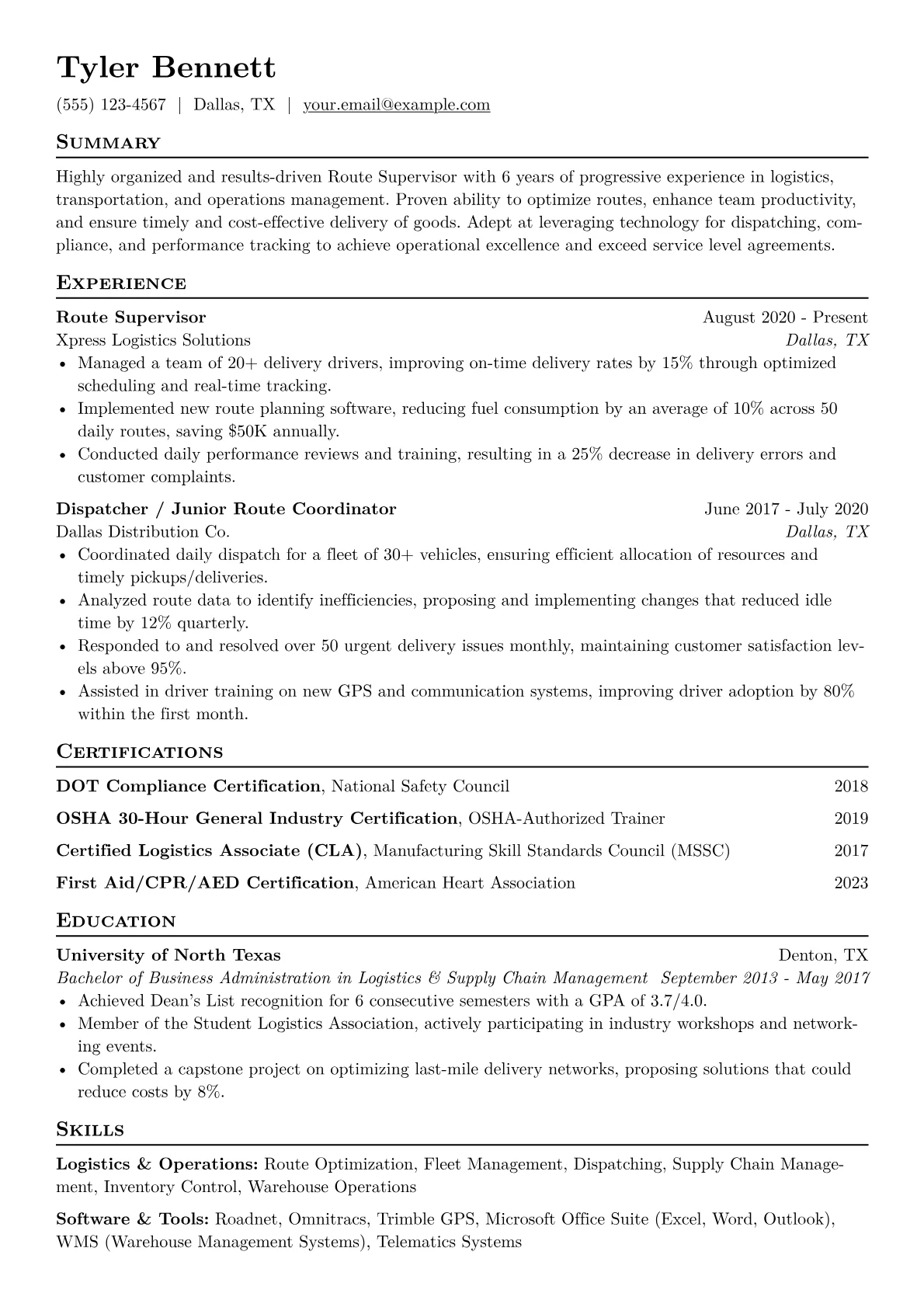 This example CV excels by structuring these critical elements effectively. Achievements are consistently quantified, such as "reduced operational costs by 12% through route consolidation" or "improved driver efficiency by 15%." Skills are clearly grouped into relevant categories, distinguishing between technical proficiencies like fleet management software and essential soft skills such as conflict resolution. Furthermore, the resume prominently highlights industry-specific tools and certifications, showcasing direct experience with relevant systems and commitment to professional standards crucial for any Route Supervisor.