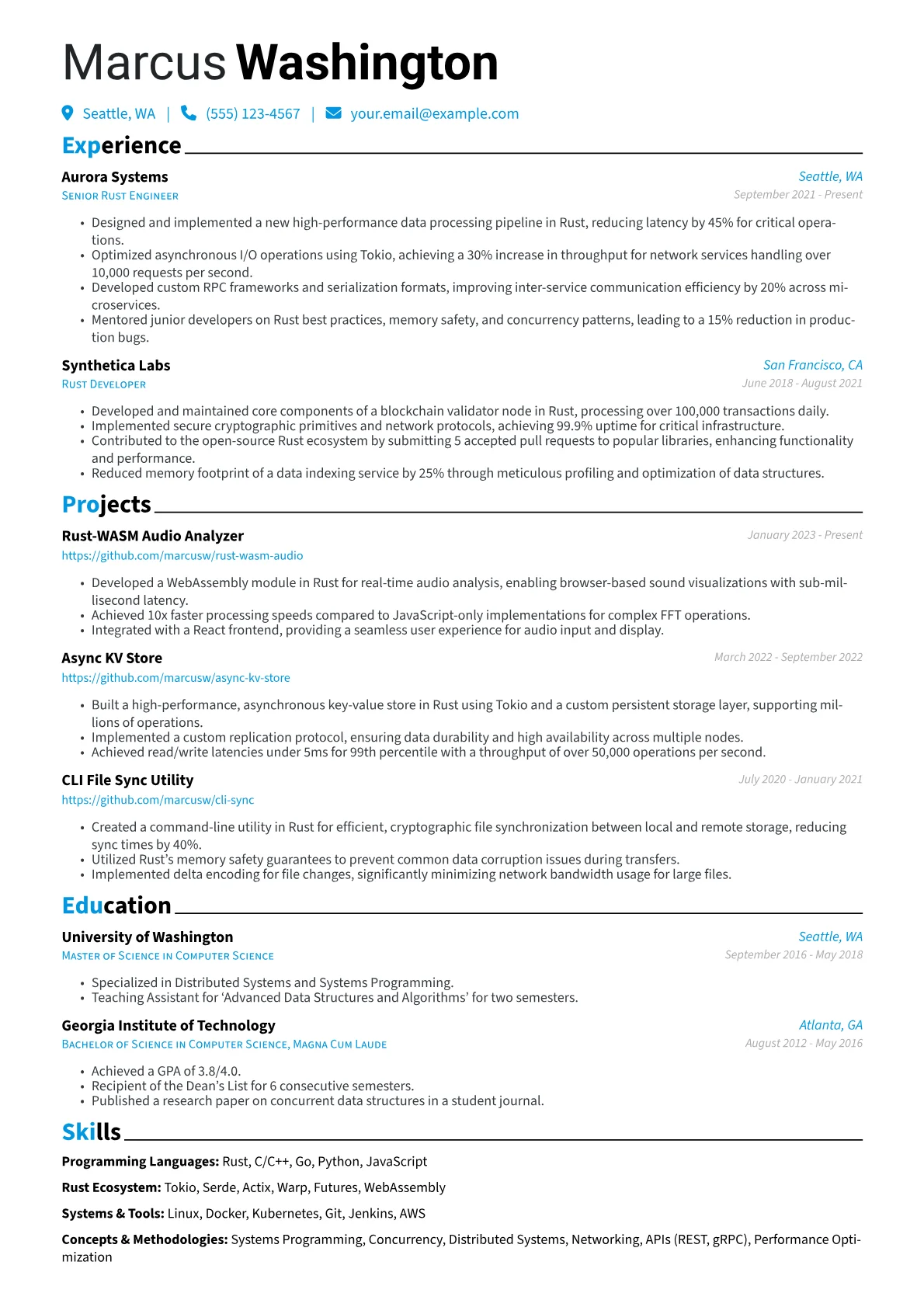 A strong Rust Developer resume clearly articulates expertise in memory safety, concurrency, and performance optimization, key areas hiring managers in technology prioritize. Demonstrating a deep understanding of ownership, borrowing, and systems-level programming, rather than just syntax, is crucial to overcoming the unique challenges of Rust development. Recruiters seek candidates who can translate these complex concepts into practical, impactful solutions.