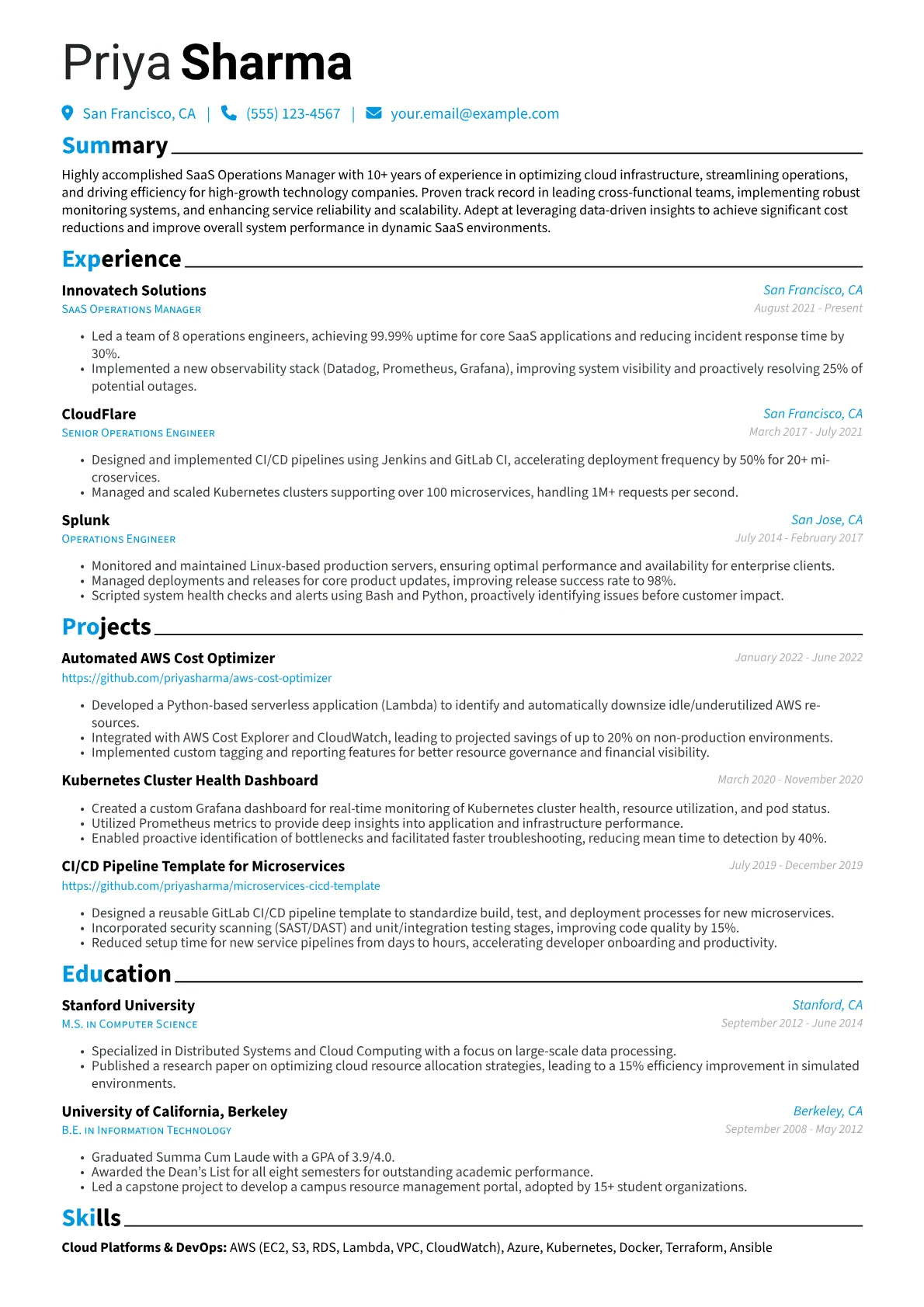 A compelling SaaS Operations Manager resume in Technology needs to clearly demonstrate impact on platform stability, efficiency, and scalability. Hiring managers specifically seek quantifiable achievements like reducing Mean Time To Resolution (MTTR), increasing system uptime, or optimizing cloud infrastructure costs. Crucial terminology includes Site Reliability Engineering (SRE) principles, CI/CD pipeline ownership, and incident management frameworks. Highlighting experience with specific technologies such as Kubernetes, AWS or Azure, Terraform, and Datadog, along with certifications like AWS Certified DevOps Engineer or ITIL, proves hands-on expertise managing complex distributed systems in a fast-paced SaaS environment.