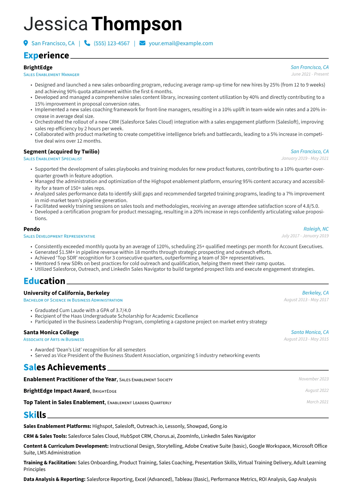 This example effectively highlights its candidate's impact through quantified achievements, showcasing percentage increases in sales productivity, training completion rates, and reduced sales cycles. Skill groupings are well-organized, featuring essential competencies like CRM administration, content strategy, and sales methodology, while relevant certifications further underscore specialized expertise. This structured approach quickly conveys the candidate's value.