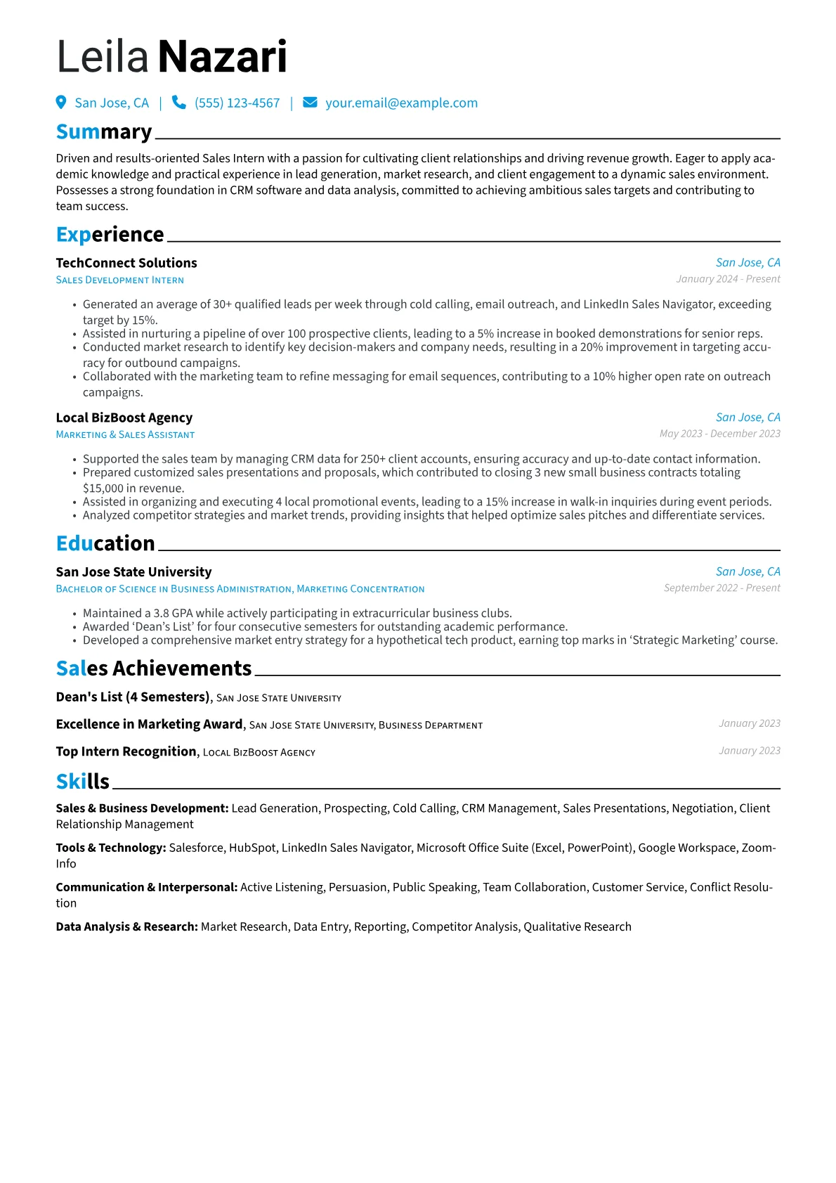 This example resume effectively showcases an intern's readiness by quantifying achievements from academic projects or volunteer roles, for instance, "researched 30 market trends" or "assisted in client outreach for 15 prospects." Skills are logically grouped under sections like "Sales & CRM Tools" and "Communication & Negotiation," clearly highlighting relevant software familiarity and interpersonal strengths. Certifications such as a HubSpot Sales Software certification or basic LinkedIn Sales Navigator training are prominently featured, immediately communicating a commitment to learning essential tools for an entry-level sales role.