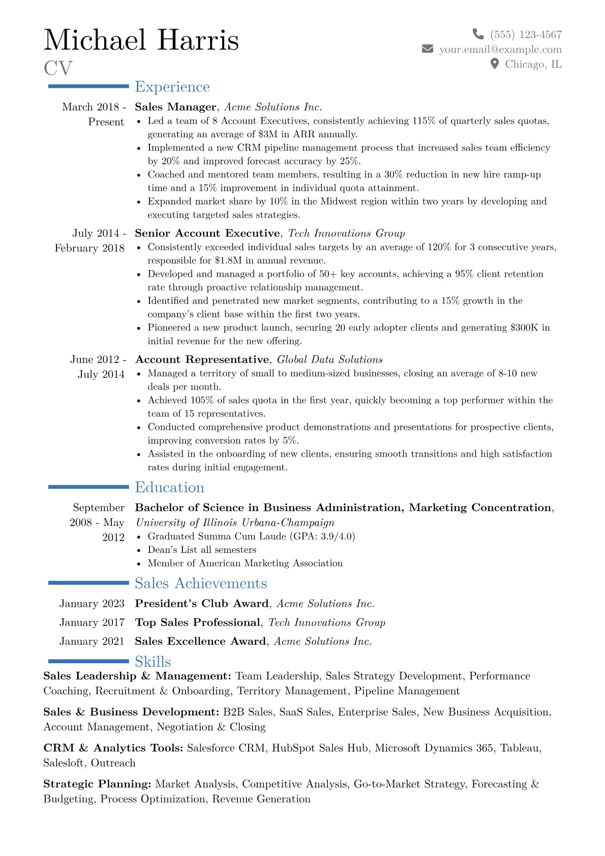This meticulously crafted template, built with JobSprout, offers an excellent foundation. It can be easily customized to develop a personalized Sales Manager resume that targets specific career aspirations.