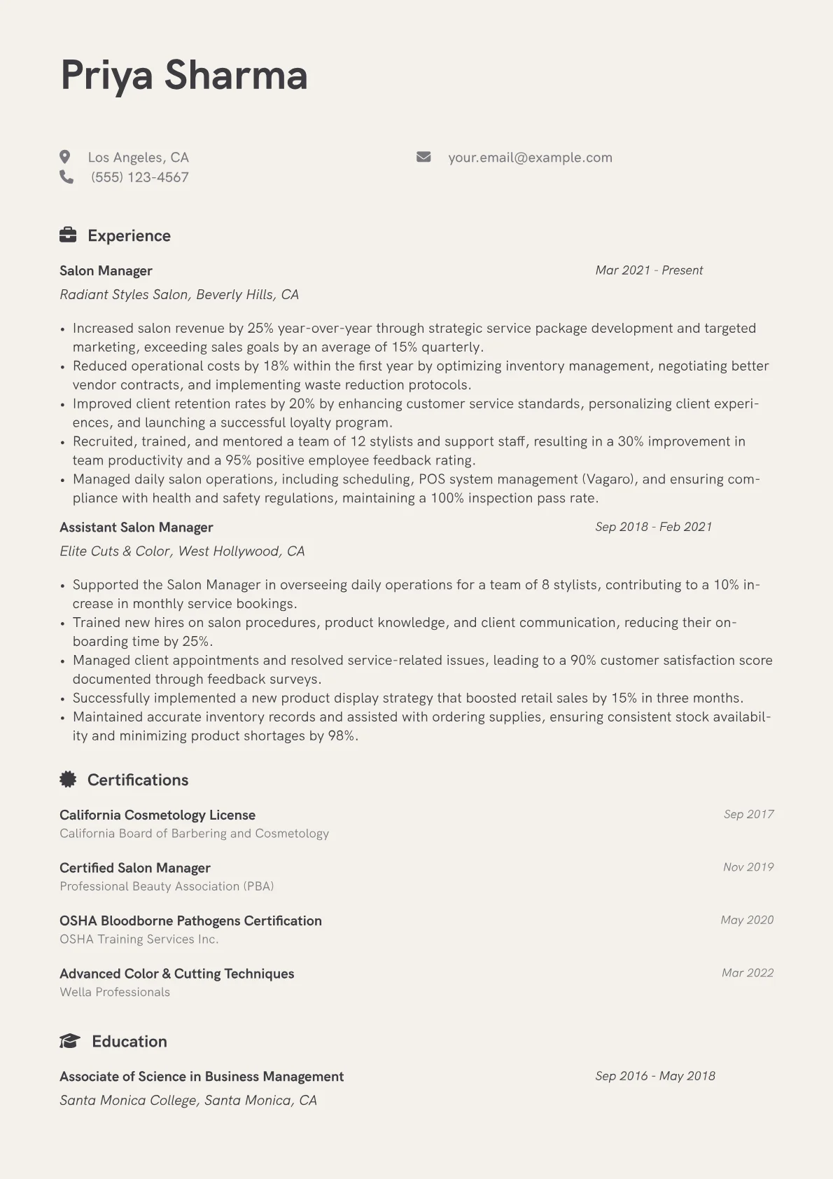 This effective template was built with JobSprout and can be remixed to create your own stand-out Salon Manager resume, tailored to your unique experience.