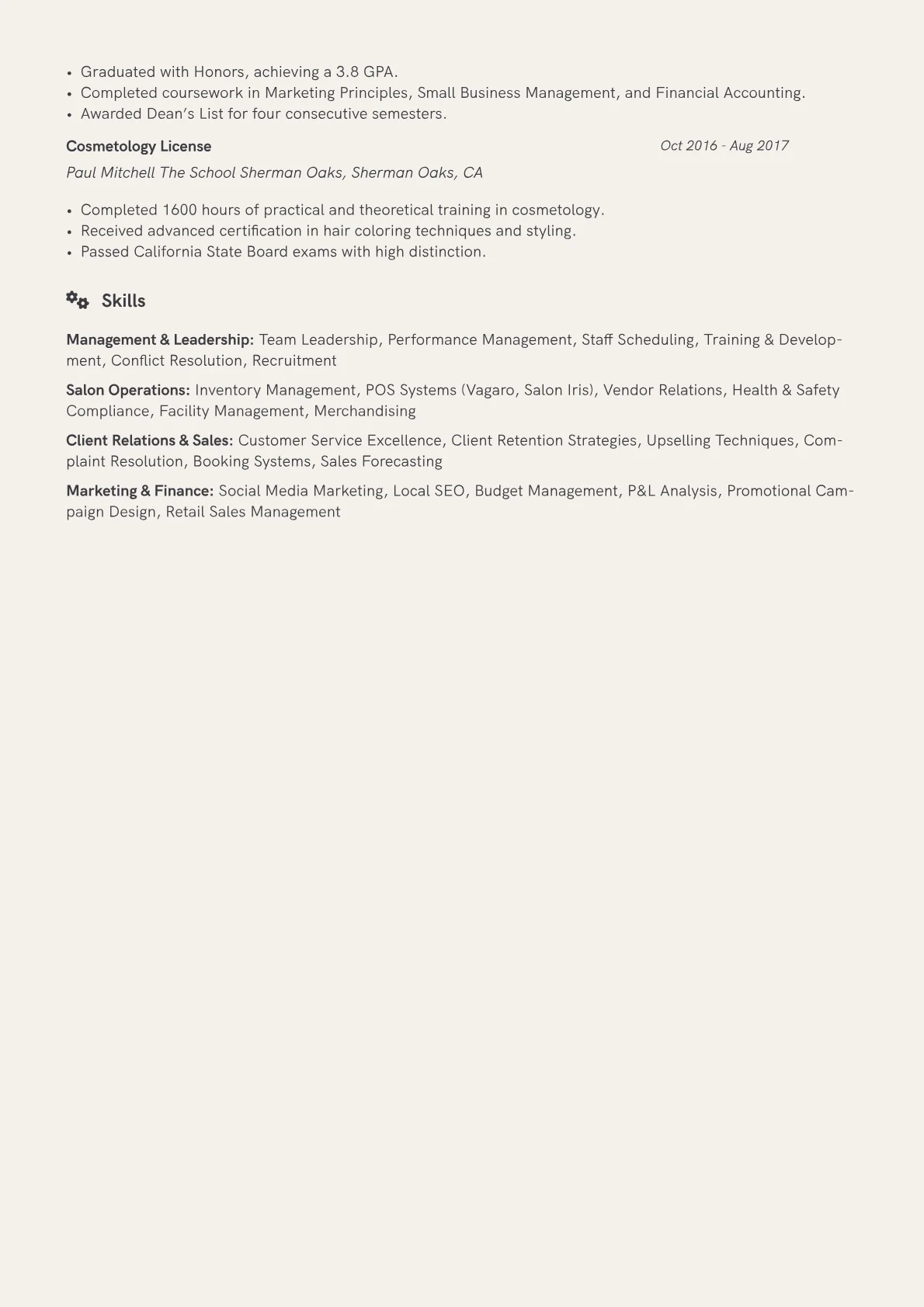 This example effectively highlights key operational strengths through quantified achievements, such as boosting revenue and improving client retention rates. It clearly groups relevant skills like POS systems management, staff training, and inventory control, providing a comprehensive overview of the candidate's capabilities for a mid-level role. The inclusion of pertinent certifications further solidifies their professional qualifications.