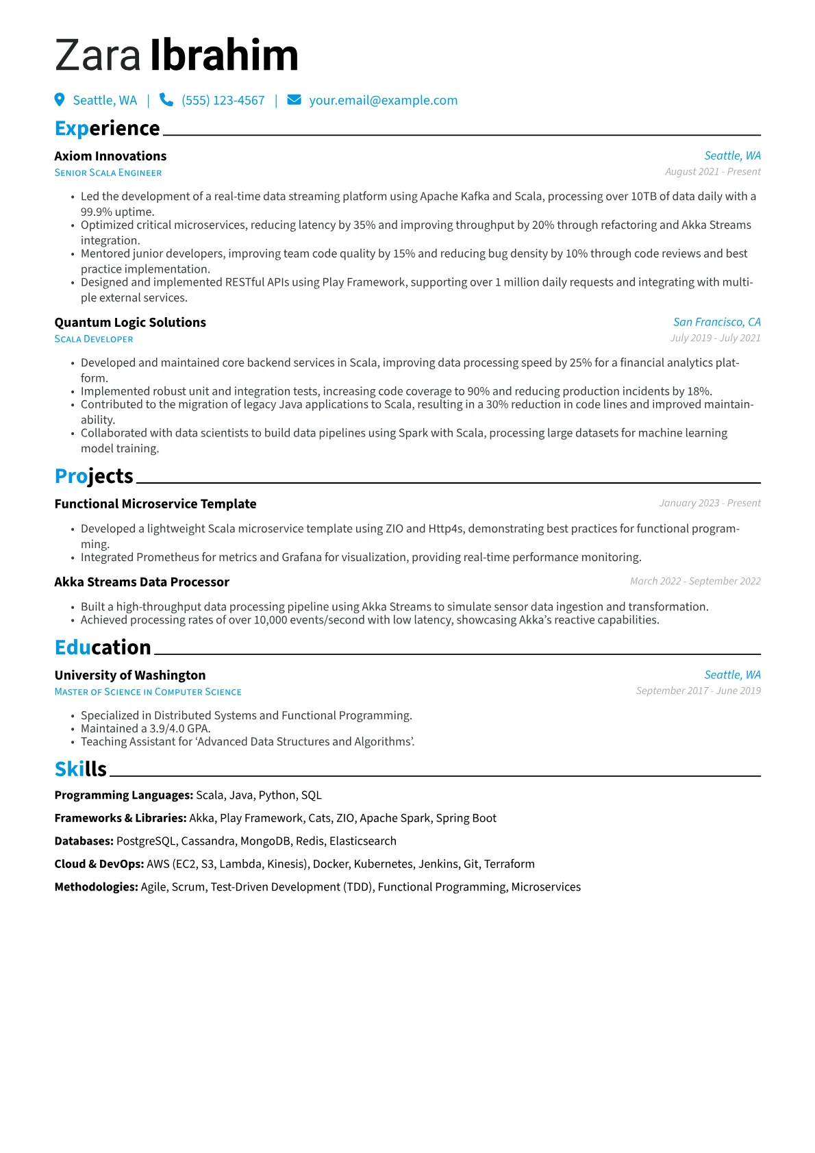 Crafting a strong Scala Developer resume requires demonstrating deep expertise in functional programming paradigms and experience with specific libraries like Akka, Spark, or Cats. Hiring managers in Technology seek evidence of building scalable, high-performance systems and solving complex distributed computing challenges. Clearly articulating impact and contribution to architectural decisions is paramount for mid-level roles.