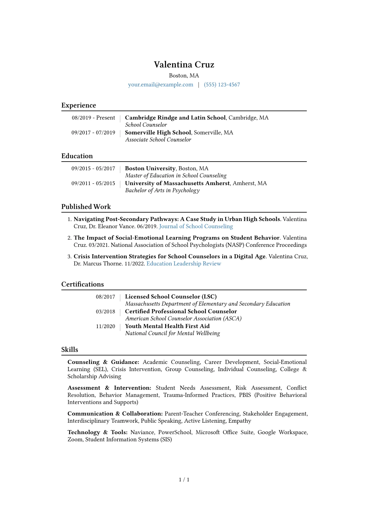 This JobSprout example excels by featuring quantified achievements that directly reflect a counselor's influence, such as reducing behavioral incidents or increasing college matriculation rates. It effectively groups relevant skills like "Social Emotional Learning," "Crisis Management," and "College & Career Readiness," making key competencies immediately apparent. Additionally, the inclusion of specific certifications vital for school counseling roles reinforces the candidate's professional qualifications and expertise.