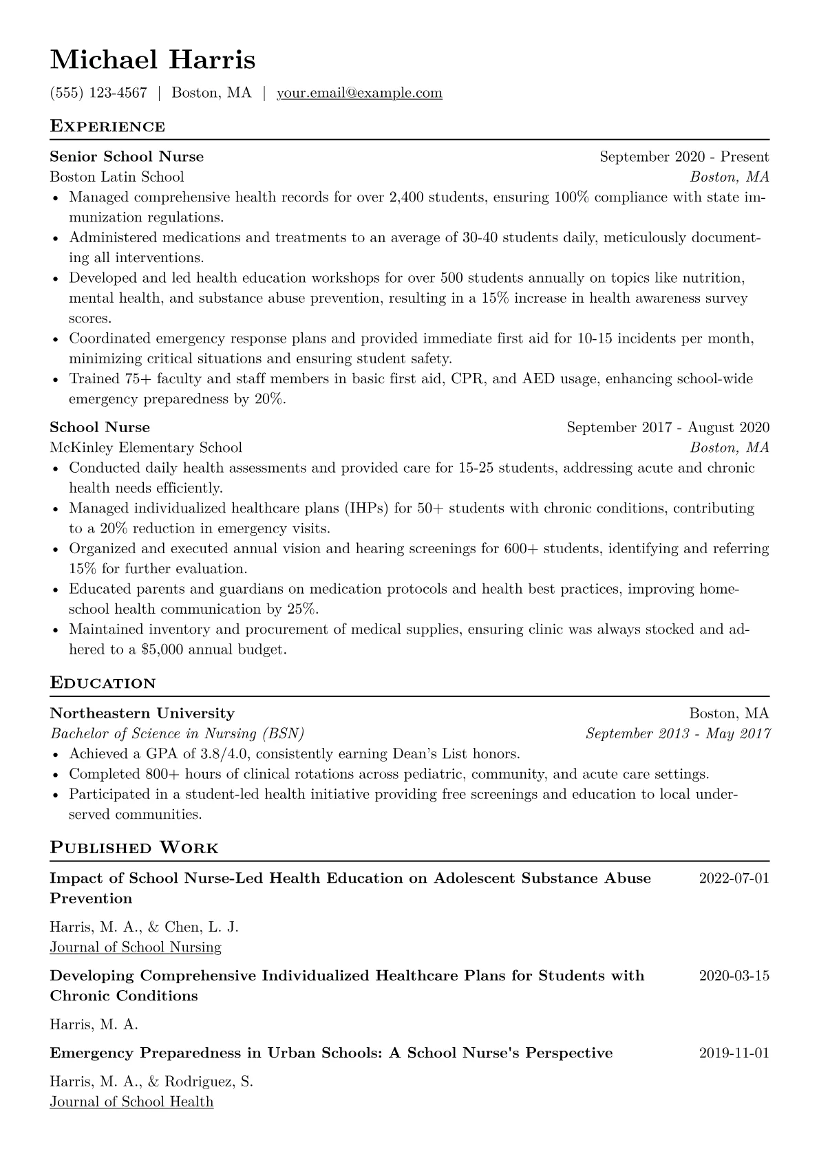 A strong School Nurse resume immediately showcases a candidate’s expertise in pediatric care, emergency response, and health promotion within an educational setting. Hiring managers prioritize demonstrable skills in medication administration, chronic disease management for diverse age groups, and effective communication with students, parents, and staff, often navigating unique resource challenges. The ability to integrate health services with academic goals is also crucial.