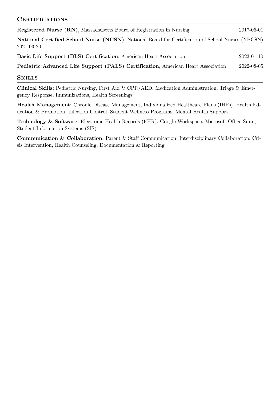 This JobSprout example excels by clearly segmenting essential skills, highlighting clinical competencies alongside health education and student support initiatives. Its use of quantified achievements, such as managing health needs for a specific student population or implementing health programs, provides concrete evidence of impact, complemented by prominent display of relevant certifications. This structure quickly conveys both breadth and depth of experience.
