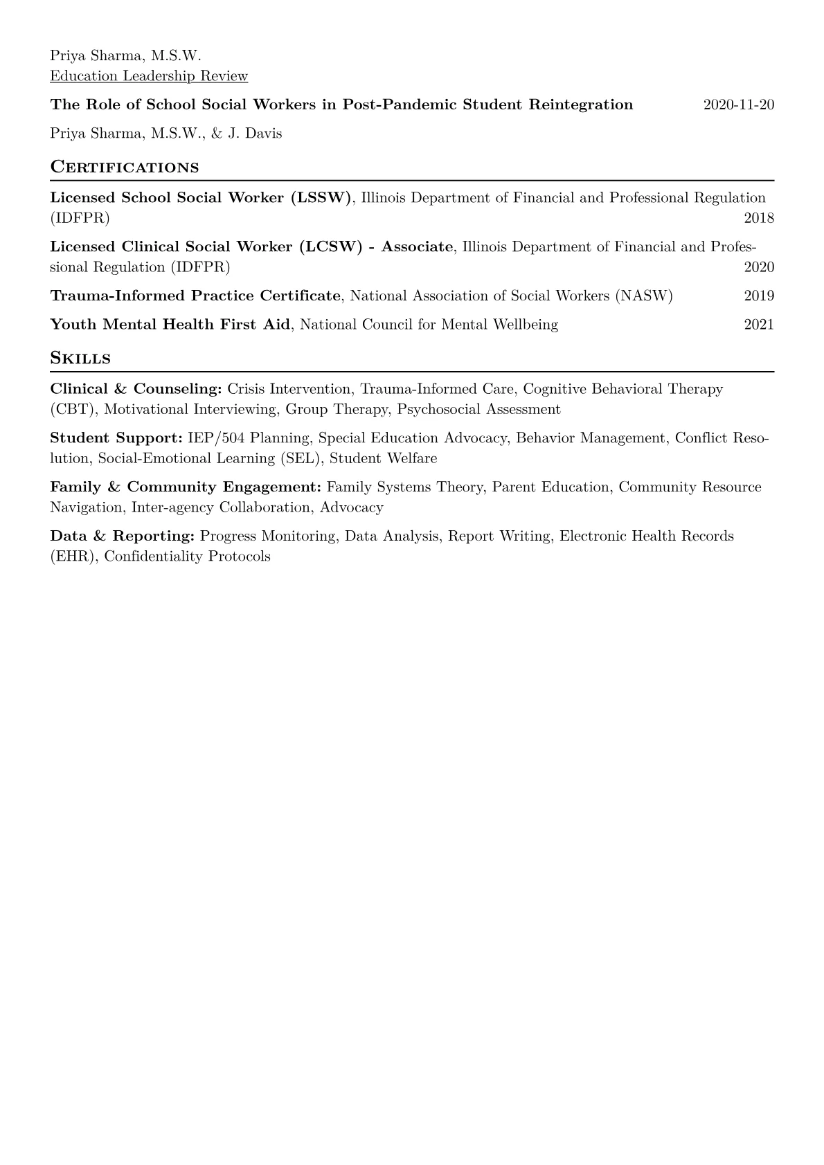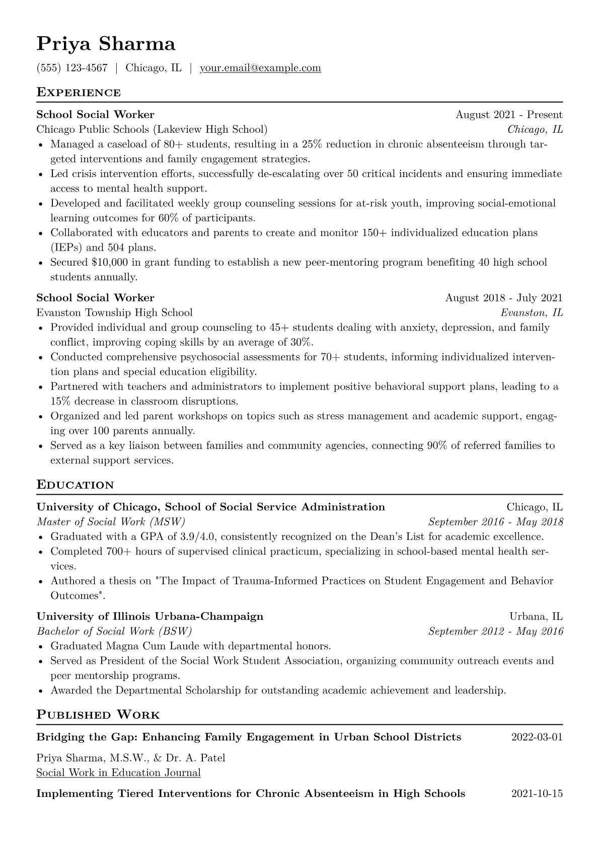 This resume example excels by clearly articulating the social worker's impact through quantified achievements, like increasing student engagement or improving family participation rates. Its thoughtful skills grouping effectively highlights essential competencies such as mental health support, trauma-informed care, and community resource development. Furthermore, the inclusion of relevant certifications reinforces professional credibility and specialized knowledge.
