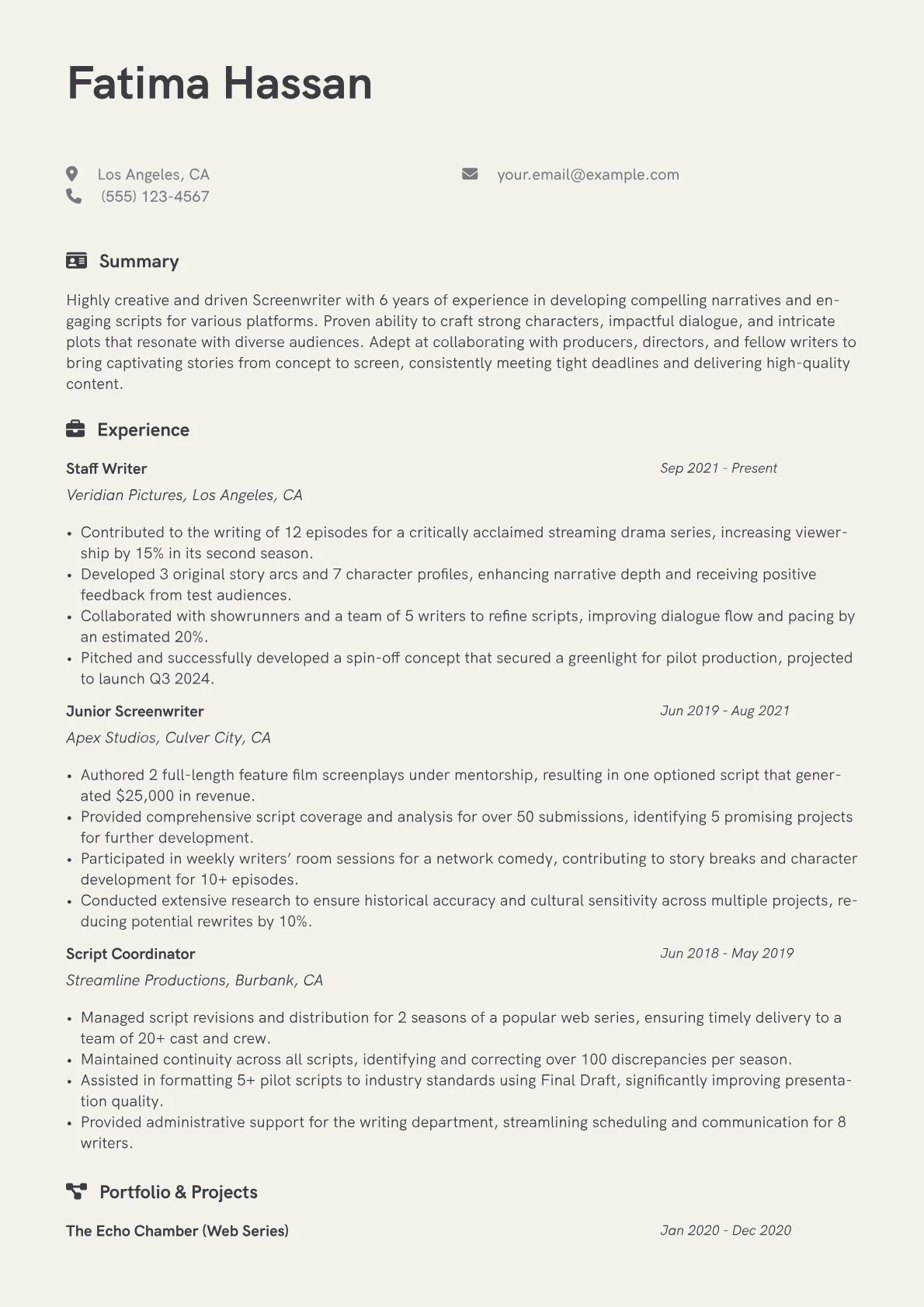 A compelling Screenwriter resume in Media & Entertainment goes beyond listing titles; it showcases tangible contributions to storytelling. Hiring managers seek specific credits on produced features, television episodes, or successful shorts, often verified via IMDb or WGA registration. Emphasizing project outcomes, such as festival selections, critical reception, or audience reach, demonstrates direct impact. Mentioning specific genres, writing awards like the Nicholl Fellowship, or successes with spec scripts and sold pilots speaks to specialized expertise and industry recognition. Proficiency in tools like Final Draft and an understanding of development terminology are also crucial.