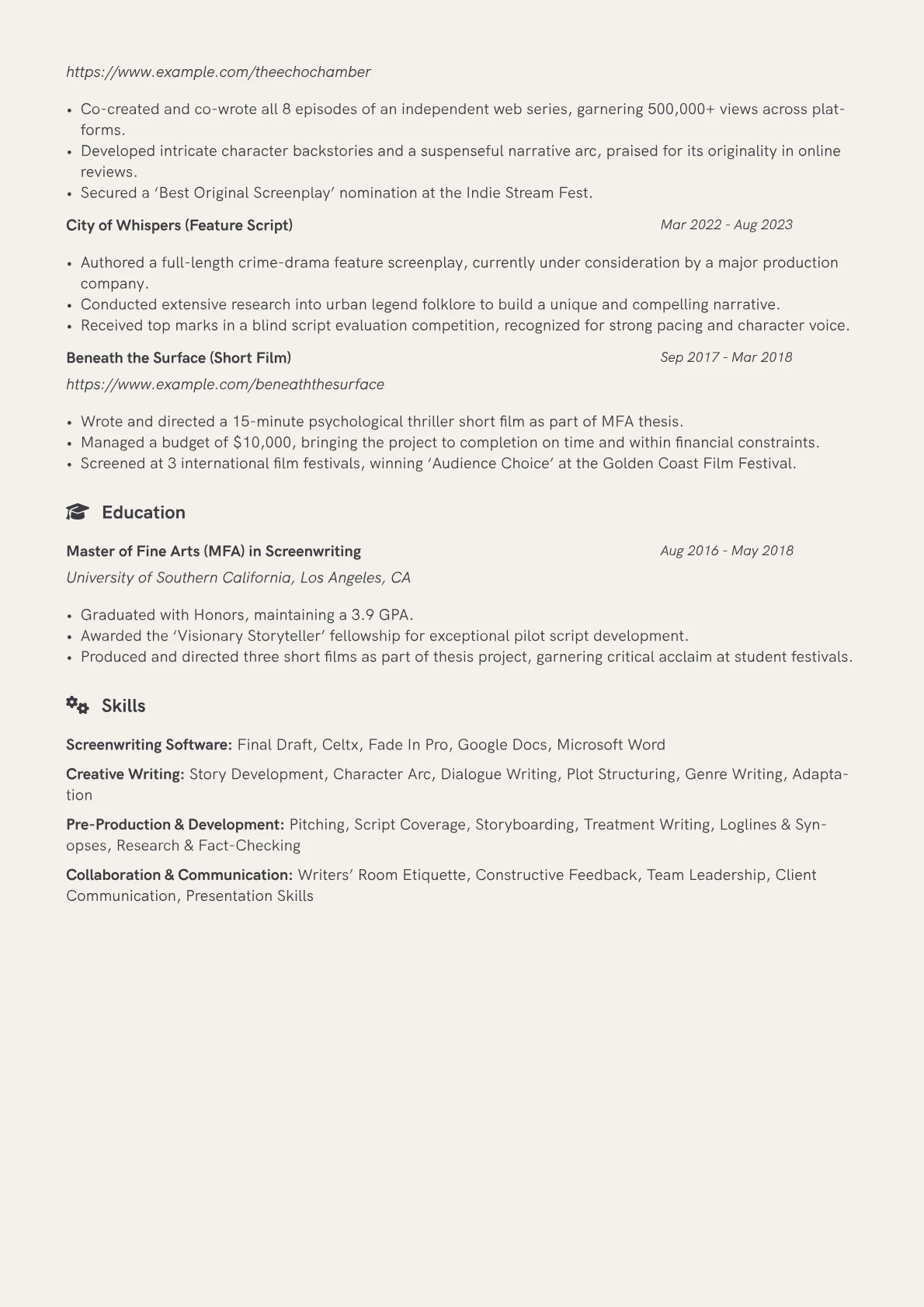The JobSprout Screenwriter example effectively highlights these critical elements. It thoughtfully groups "Produced Credits" with quantifiable achievements, for instance, "Scripted two episodes for a streaming series reaching 750,000 unique viewers." Skills are logically categorized, separating "Screenwriting Software" (Final Draft, Movie Magic) from "Story Development" (Logline Creation, Character Arc Design) to provide clarity. The template intelligently positions "Awards and Recognition," detailing accolades such as "Semi-finalist, Austin Film Festival Screenwriting Competition," alongside relevant WGA registration or Guild memberships, affirming professional standing.