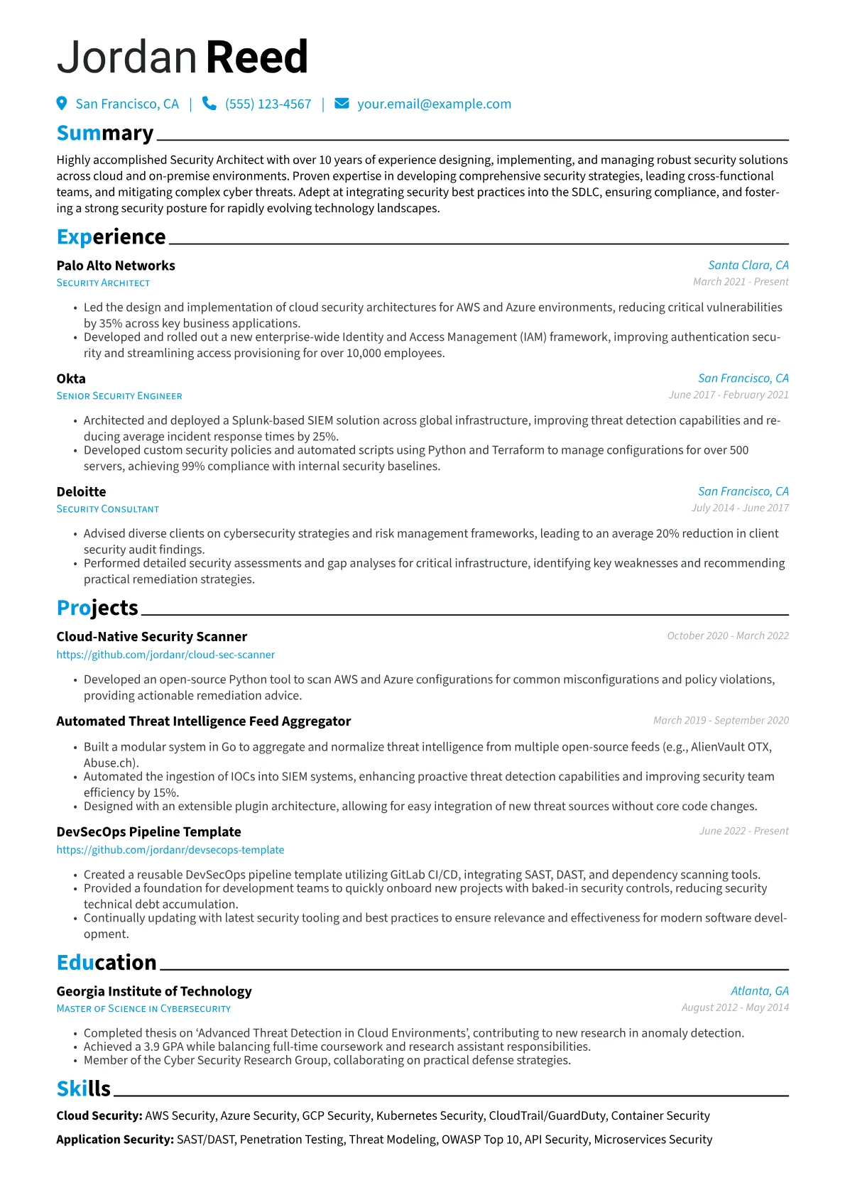 This template was built with JobSprout and can be remixed to create your own tailored Security Architect resume, leveraging its structure for maximum impact.