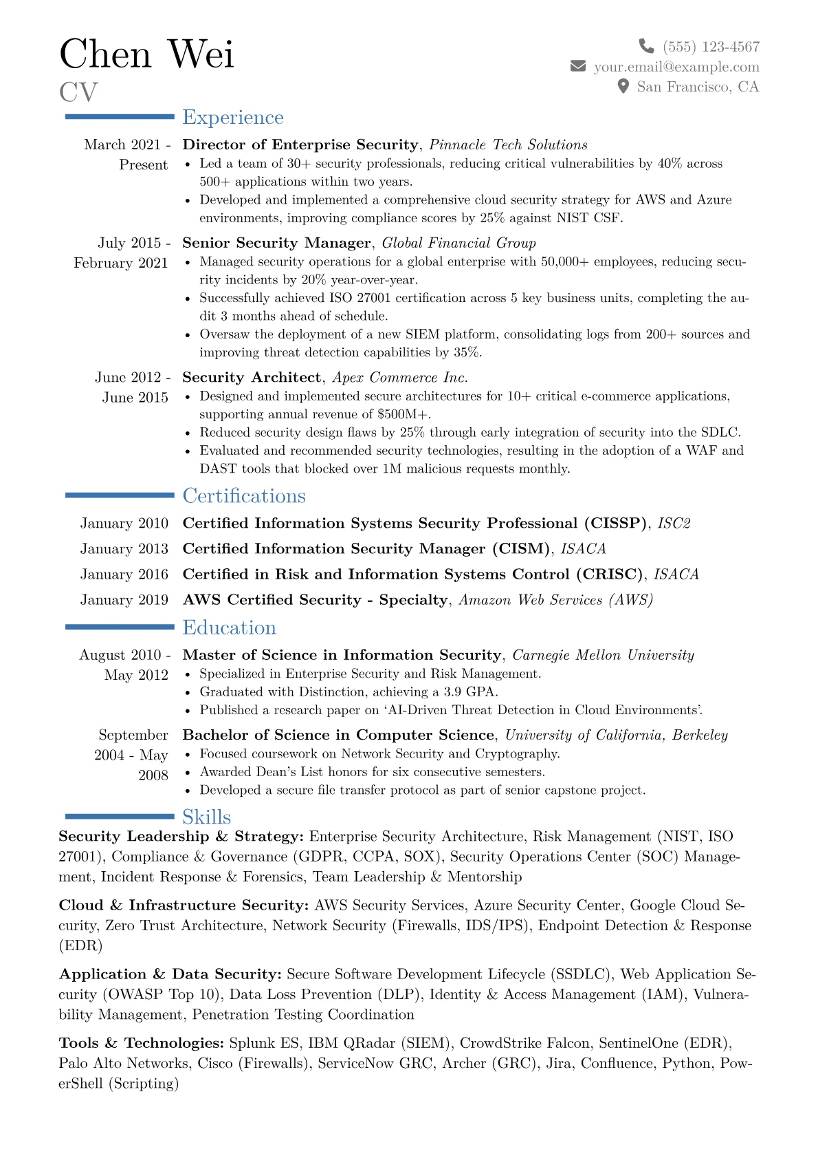 This excellent Security Director resume was crafted with JobSprout’s intuitive CV builder. You can easily remix this template and personalize it to build your own compelling application.