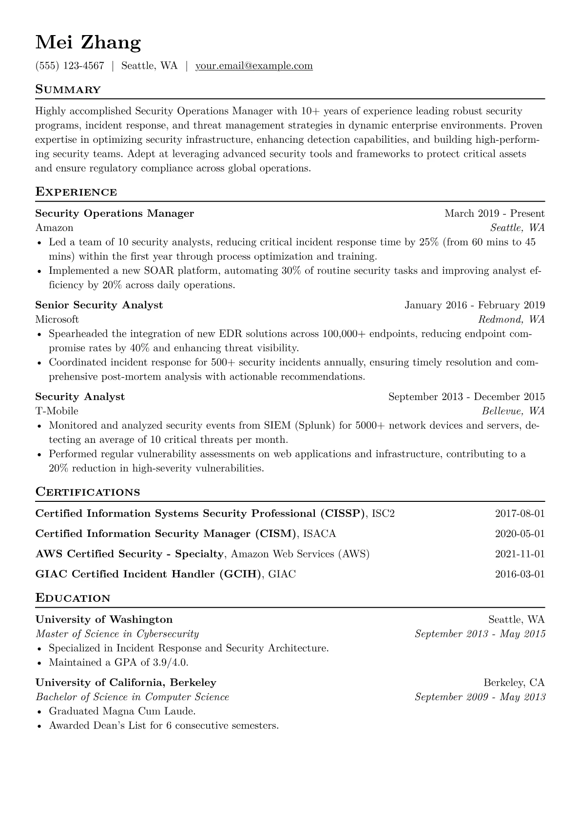 This template was built with JobSprout and can be remixed to create your own tailored Security Operations Manager resume.