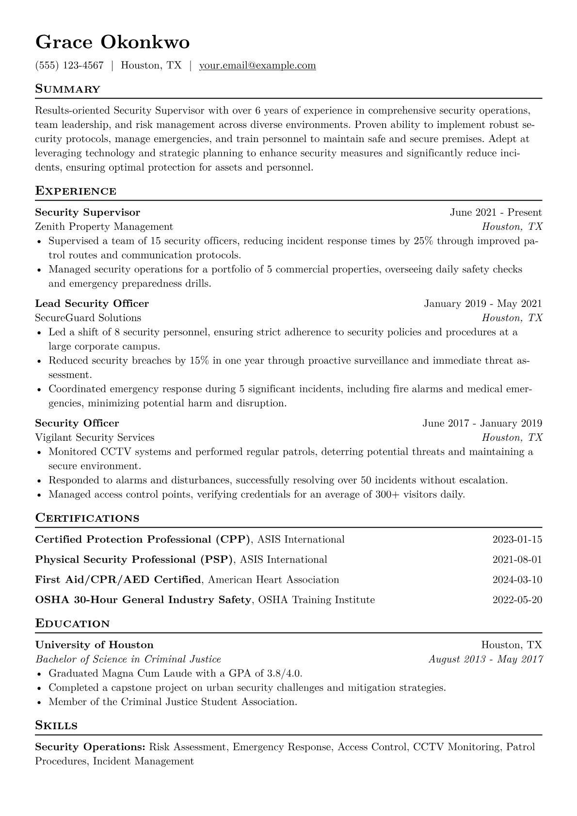 This template was expertly crafted using JobSprout, offering a robust foundation. It can be easily remixed to create your own tailored Security Supervisor resume.