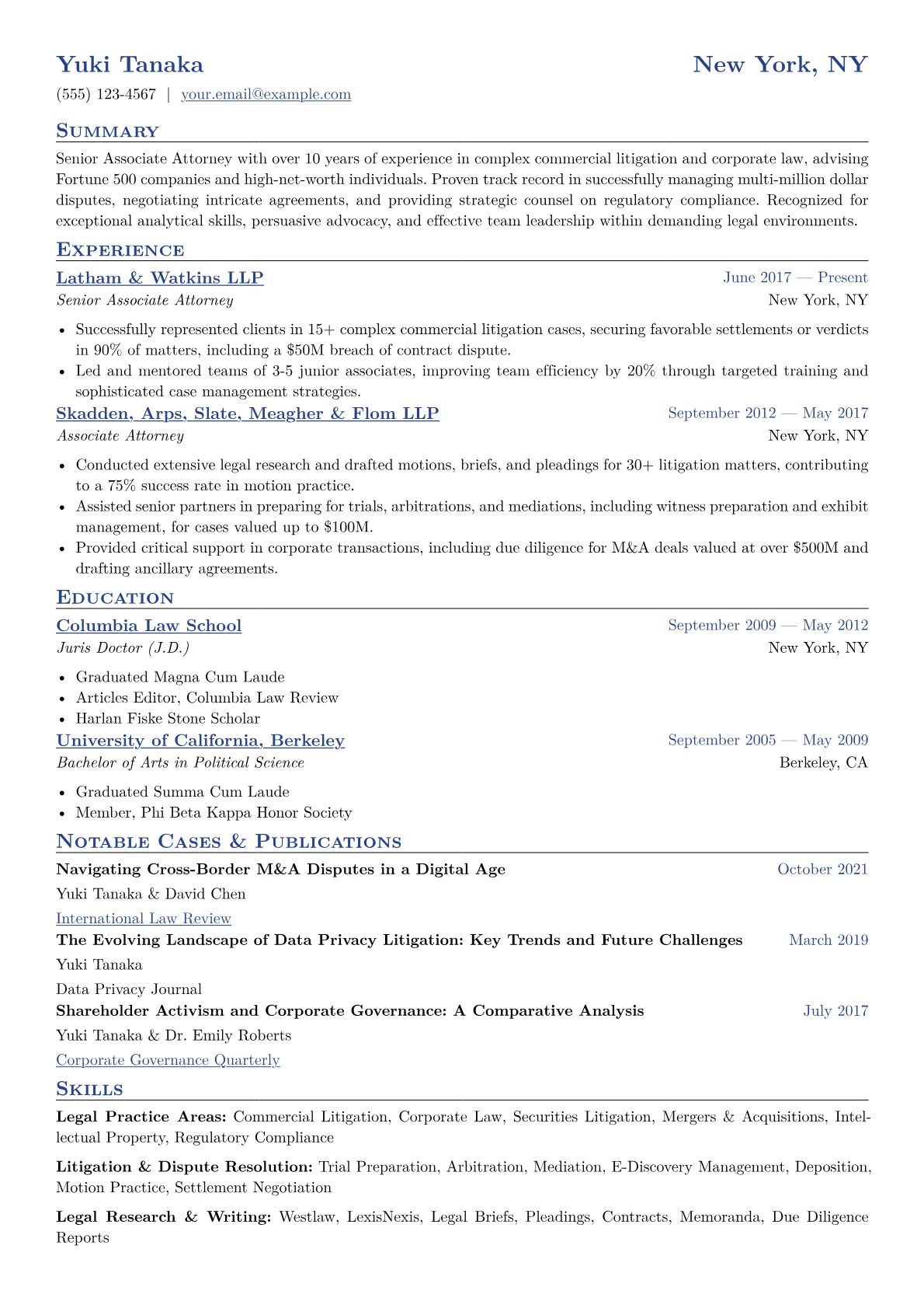 This template was built with JobSprout and can be remixed to create your own tailored Senior Associate Attorney resume.