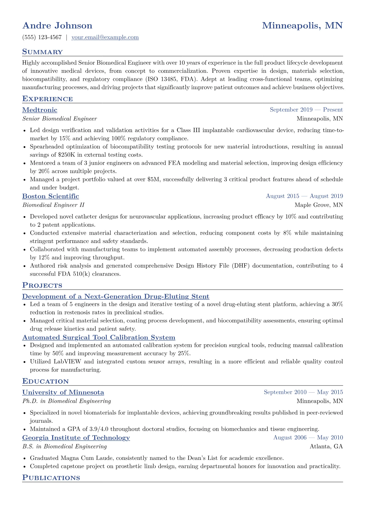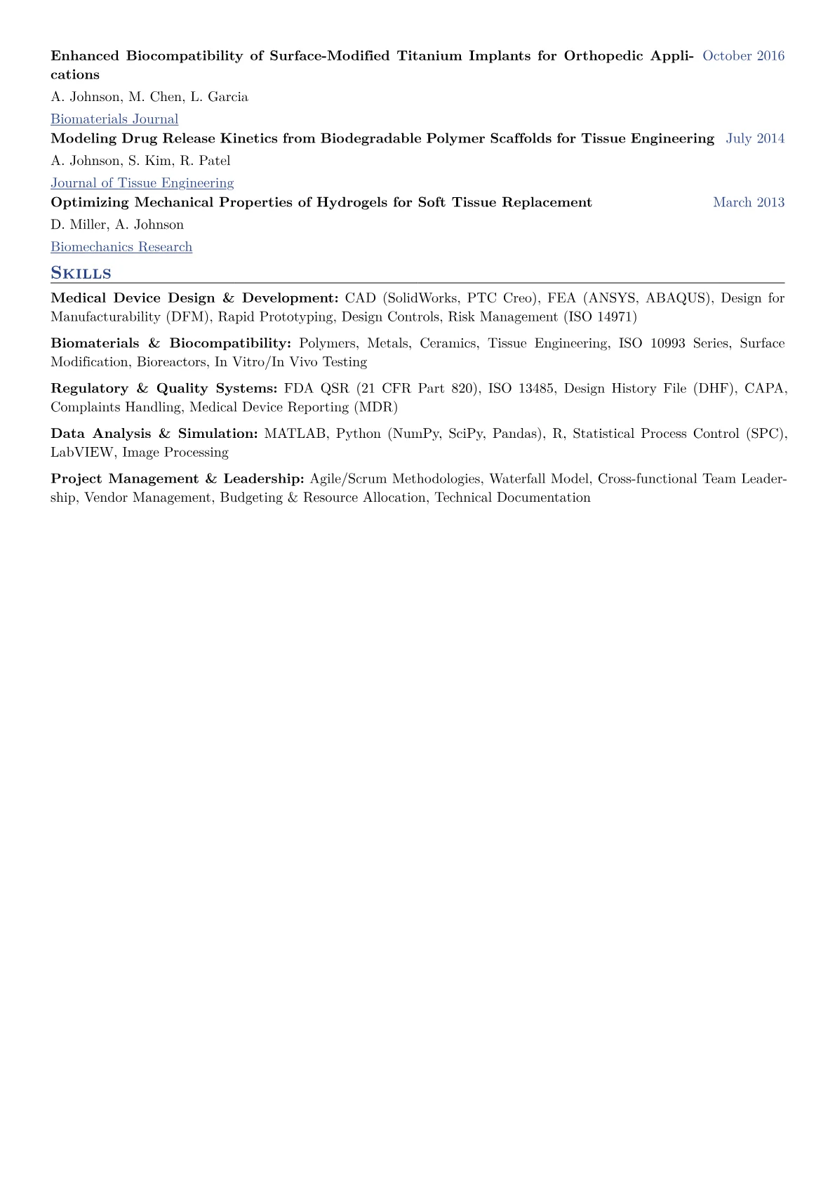 A compelling Senior Biomedical Engineer resume in Manufacturing must directly address the industry's rigorous demands. Hiring managers prioritize candidates who demonstrate tangible impact on production efficiency, regulatory compliance, and quality systems. This means showcasing achievements like reducing defect rates, optimizing production line throughput, or successfully leading validation efforts for medical devices (IQ, OQ, PQ). Key certifications such as ISO 13485 Lead Auditor or Six Sigma Black Belt are essential, alongside deep familiarity with FDA 21 CFR Part 820, GMP, and Design for Manufacturability (DFM) principles. The nuance lies in bridging product development with scalable, compliant manufacturing processes.