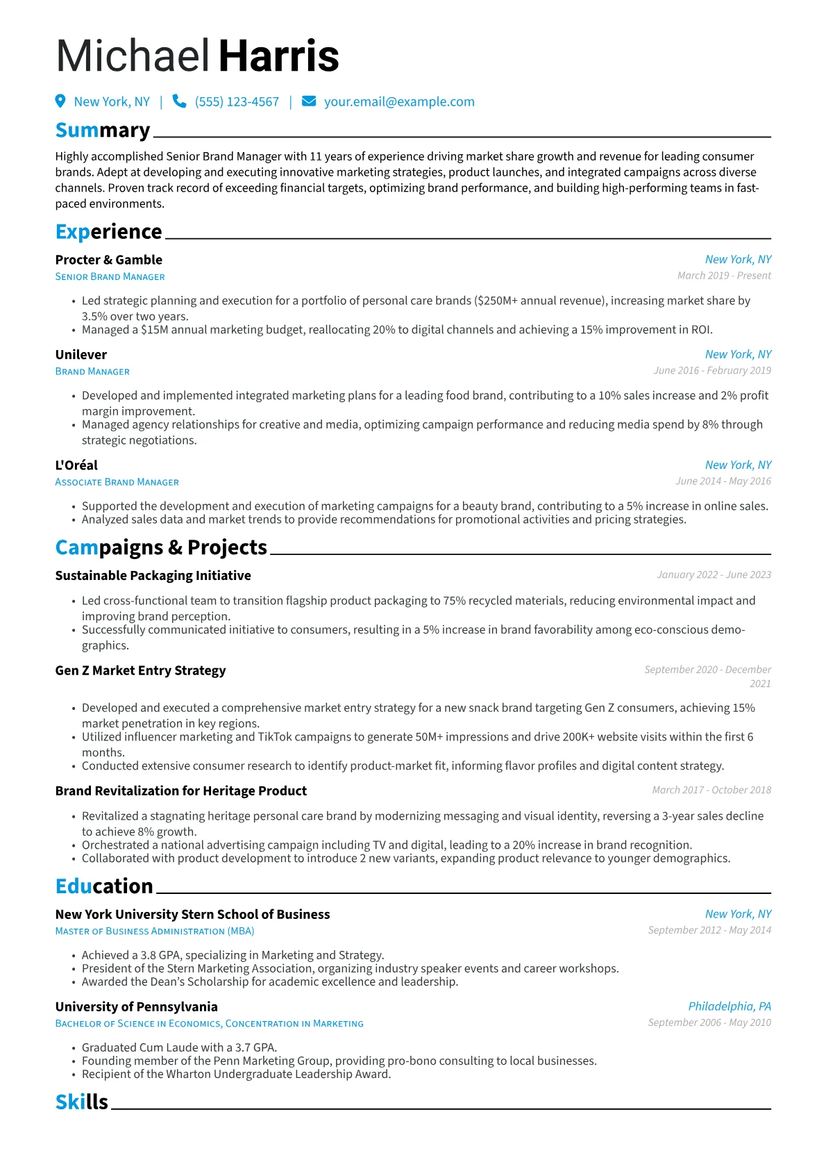 For a Senior Brand Manager in Marketing & Advertising, a compelling resume articulates strategic leadership and quantifiable impact. Hiring managers seek evidence of driving brand equity, increasing market share, and leading integrated marketing communications across diverse channels. Key achievements include growing brand revenue by specific percentages, successfully launching multi-channel campaigns, and managing significant marketing budgets. Relevant terminology like ‘consumer insights,’ ‘go-to-market strategy,’ and ‘ROI optimization’ resonates deeply, often alongside proficiency in platforms like Salesforce Marketing Cloud or Google Analytics.