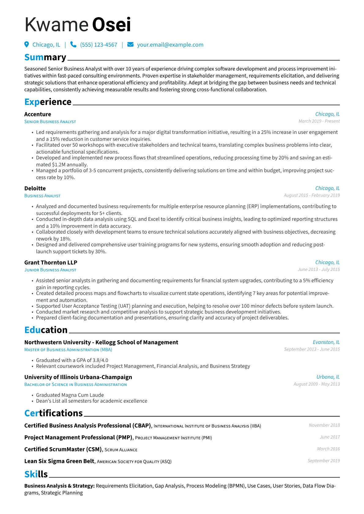 This robust template was built with JobSprout and can be remixed to create your own tailored Senior Business Analyst resume, showcasing your specific consulting expertise and operational achievements.