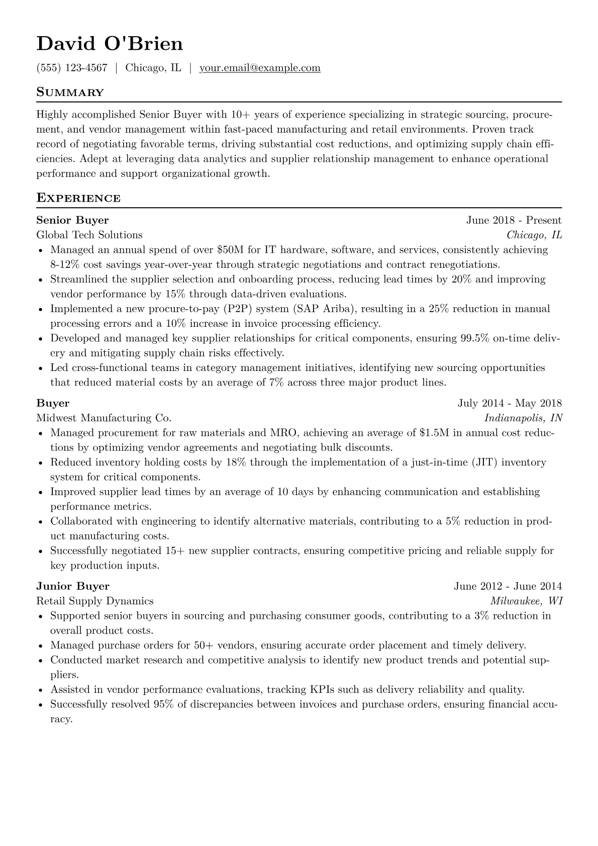 This example CV expertly structures a Senior Buyer's experience to immediately capture attention. Achievements are presented with clear metrics, detailing how the candidate reduced costs by specific percentages or managed multimillion dollar spend categories. Skills are logically grouped under headings such as "Strategic Sourcing," "Contract Negotiation," and "Supplier Performance Management," providing an easy overview of expertise. The resume prominently features relevant certifications and technology proficiencies, signaling advanced capabilities in data analysis and procurement software crucial for strategic decision-making.