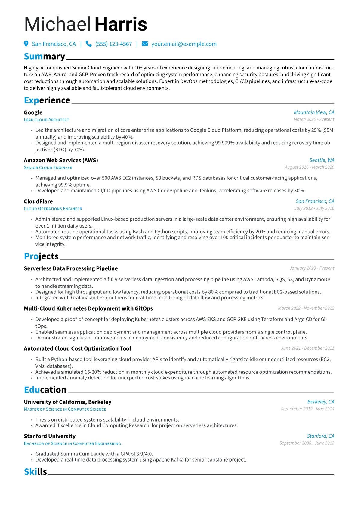 This example CV excels at presenting a Senior Cloud Engineer's advanced capabilities. Achievements are clearly quantified, detailing contributions to cost optimization and system performance. Skills are thoughtfully grouped by cloud provider and functional area, highlighting proficiency across AWS, Azure, and GCP, alongside specific expertise in CI/CD pipelines, security hardening, and data architecture. Professional-level certifications are prominently displayed, immediately validating the candidate's deep knowledge. The inclusion of specific tools like Prometheus, Grafana, and Ansible further underscores practical, hands-on experience, showcasing leadership in designing and deploying enterprise-grade cloud solutions.