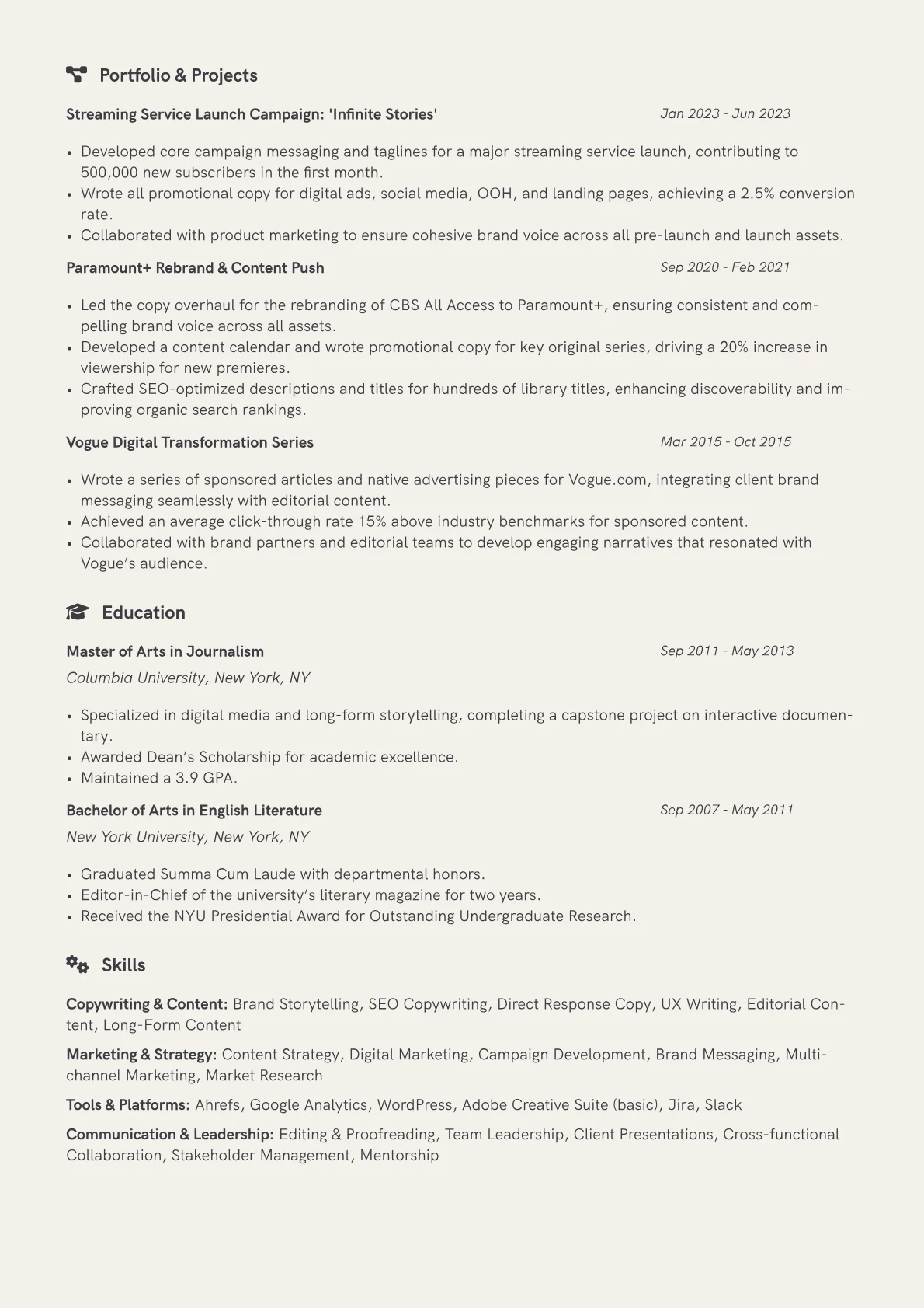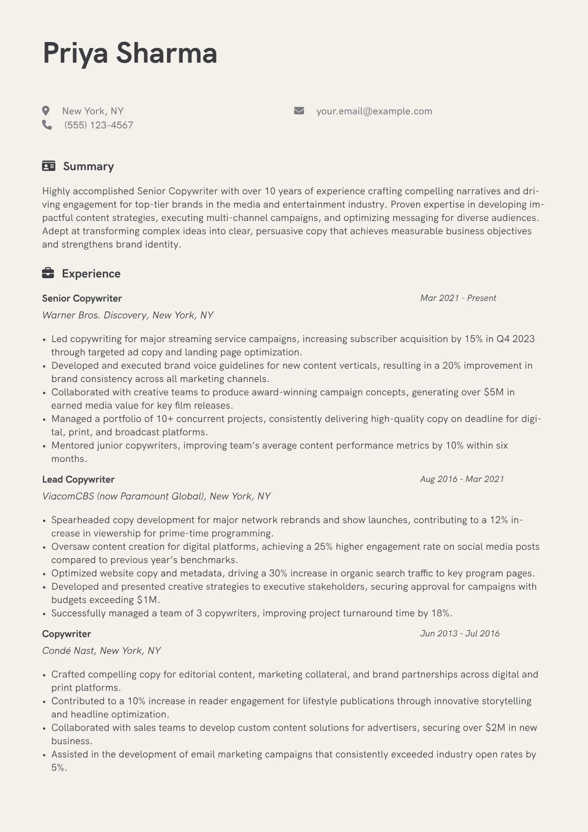 This template was built with JobSprout and can be remixed to create your own tailored Senior Copywriter resume.