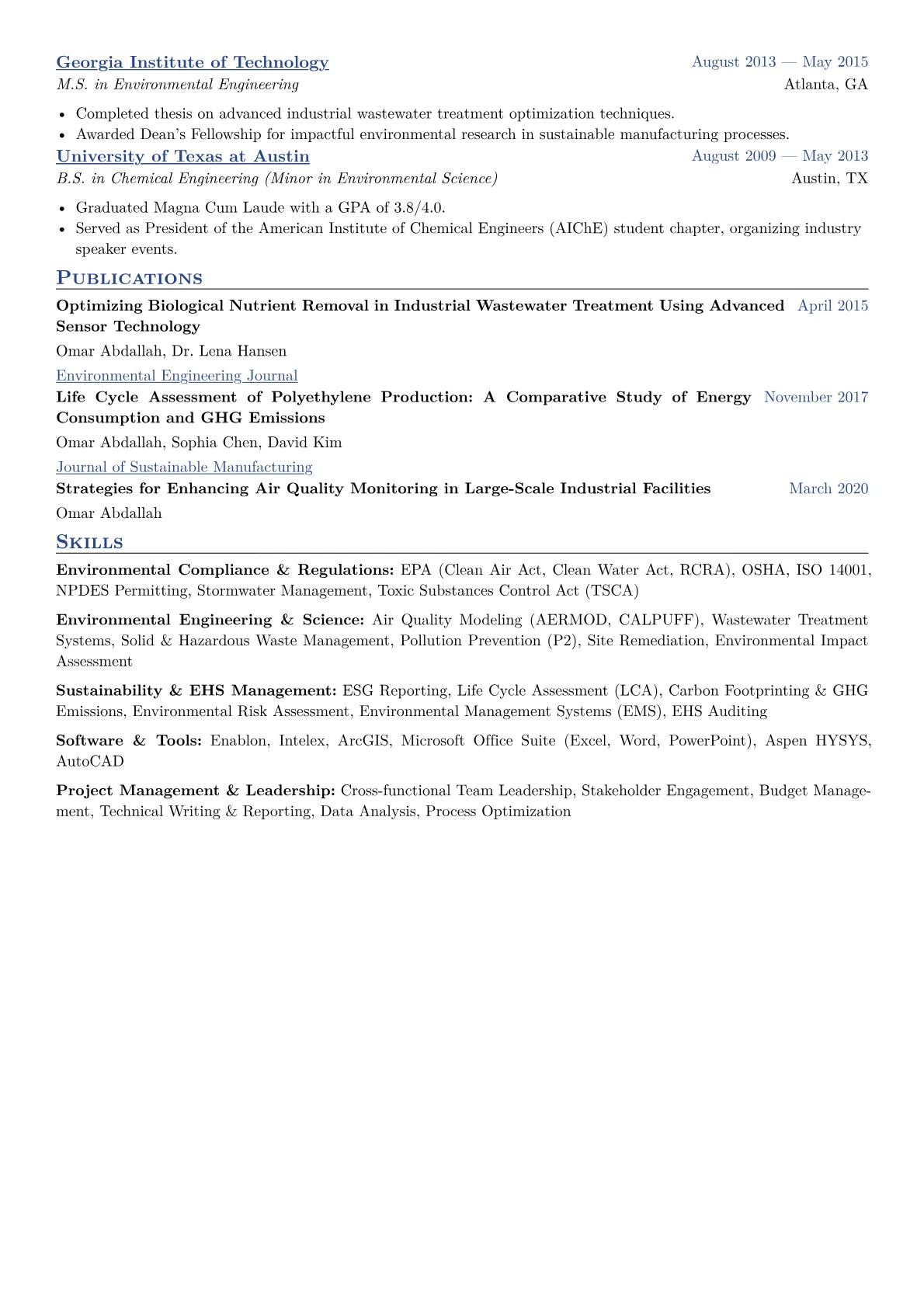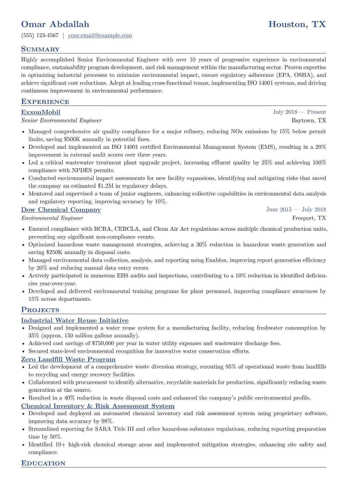 This example resume effectively showcases these crucial elements. It quantifies achievements by detailing percentage reductions in waste generation or specific dollar savings from sustainability initiatives, directly addressing business impact. Skills are strategically grouped into categories such as Regulatory Compliance, Environmental Management Systems, and Technical Analysis, ensuring quick identification of relevant expertise. Critical certifications like PE licensure are prominently displayed, alongside proficiency in industry-specific tools and software. The structure also highlights leadership in cross-functional teams and mentorship of junior engineers, key for senior roles.