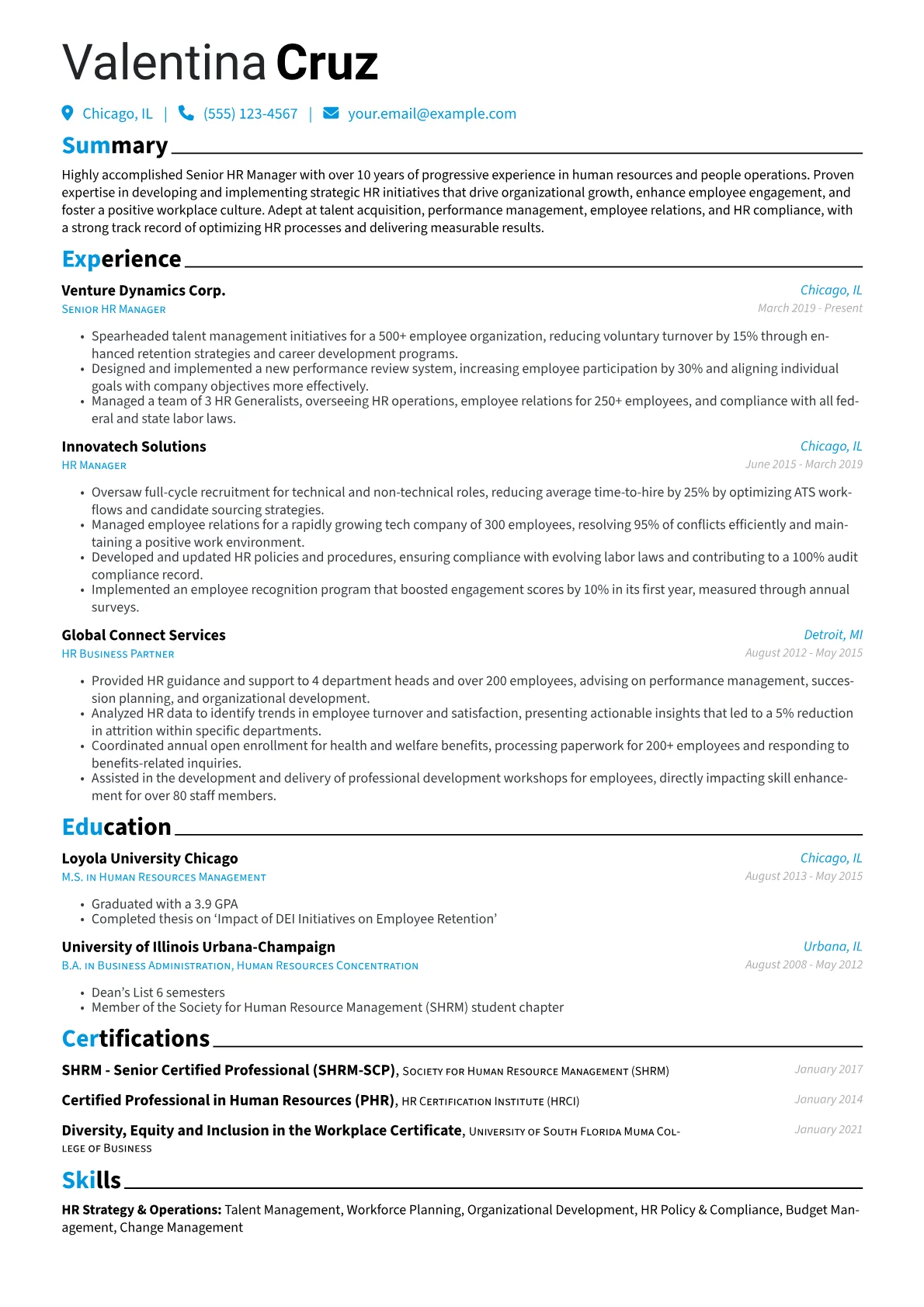 This template was built with JobSprout’s intuitive platform and can be easily remixed to create your own tailored Senior HR Manager resume. It provides an excellent framework for highlighting your strategic HR contributions effectively.