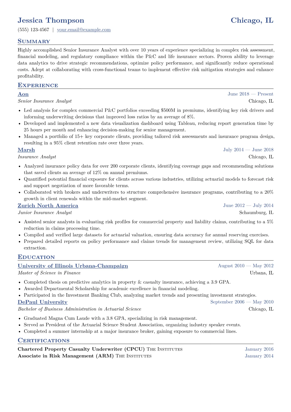 A strong Senior Insurance Analyst resume in Finance and Banking emphasizes quantifiable achievements in risk mitigation, premium optimization, and strict adherence to regulatory frameworks like Solvency II or NAIC regulations. Hiring managers specifically look for demonstrated expertise in IFRS 17, actuarial methodologies, and advanced financial modeling, alongside certifications such as CPCU or FLMI. These details signal the deep industry understanding and strategic impact expected of a senior professional managing complex risk portfolios.