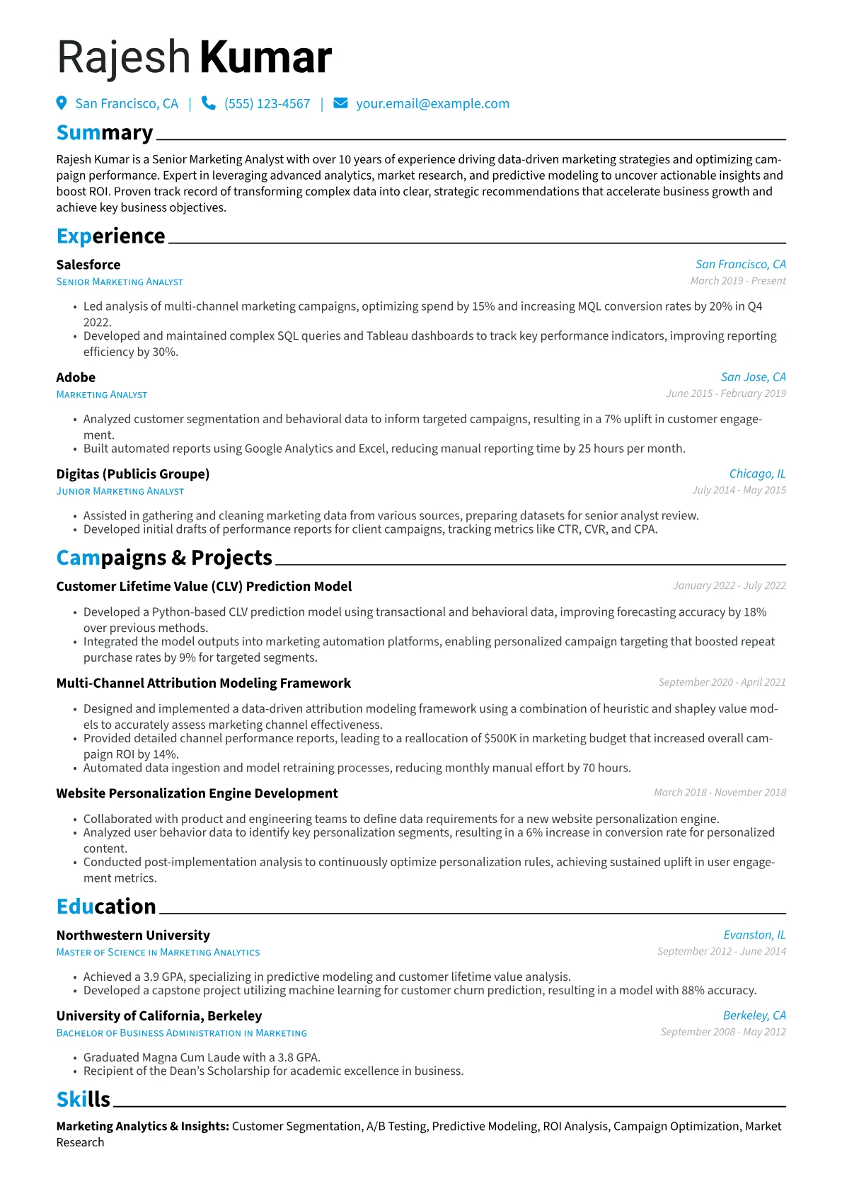 The example resume effectively highlights these critical elements. Accomplishments are precisely quantified, detailing specific increases in ROAS or reductions in customer acquisition costs, immediately communicating value. Skills are intelligently grouped under relevant categories like "Analytical Platforms" and "Marketing Technologies," ensuring quick readability for recruiters. Furthermore, the resume prominently features relevant certifications and proficiency with tools such as Tableau and Salesforce Marketing Cloud, affirming the candidate's technical depth crucial for a Senior Marketing Analyst.