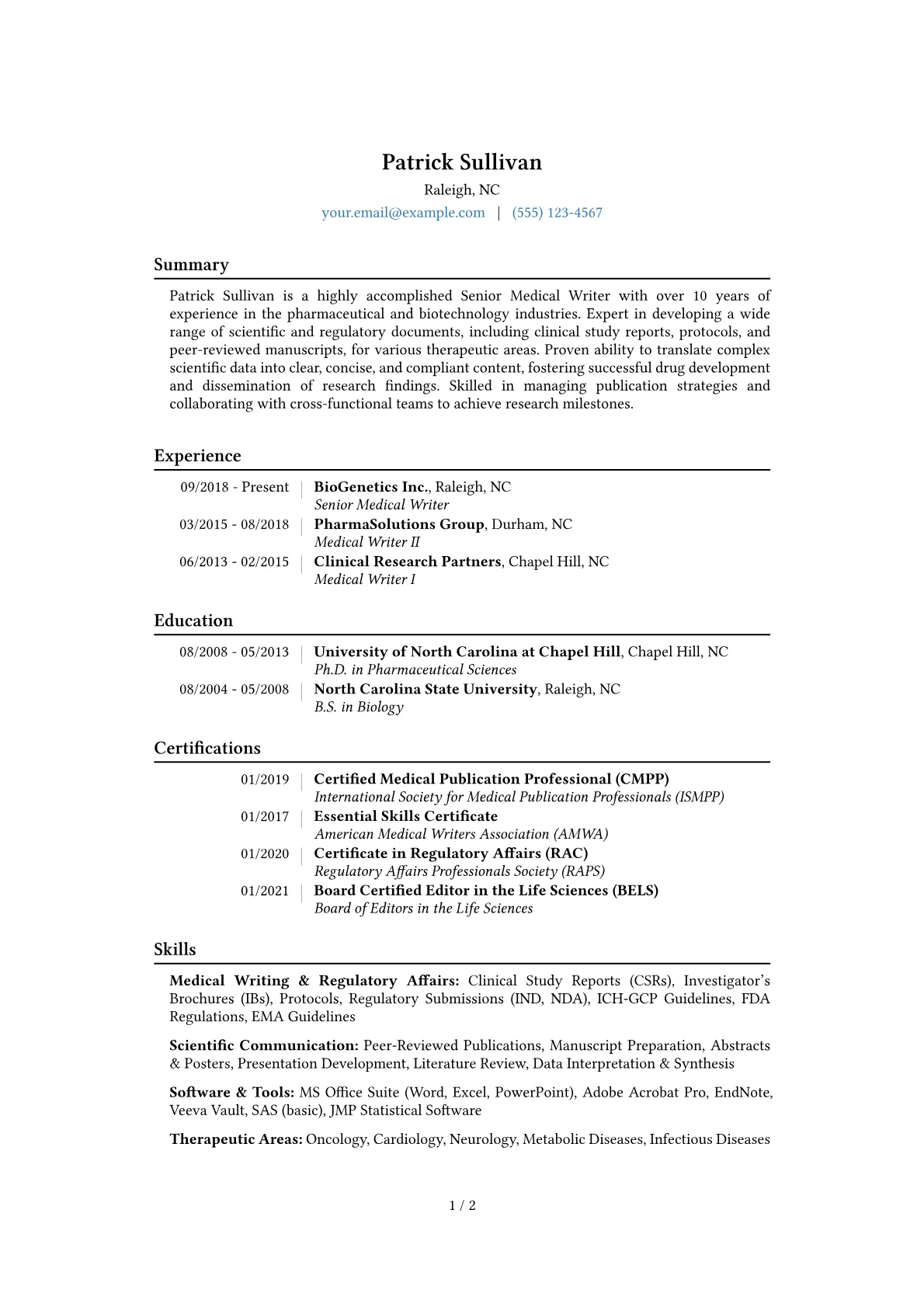 The provided example effectively showcases these critical elements. It quantifies achievements by detailing the number of successful regulatory submissions and publications, clearly demonstrating impact. Skills are strategically grouped into categories like "Regulatory Affairs," "Clinical Development," and specific "Therapeutic Areas" (e.g., Oncology, Rare Diseases), ensuring immediate relevance for recruiters. Furthermore, the resume highlights proficiency in essential tools like Veeva Vault and EndNote, alongside relevant certifications such as CMPP or BCMAS, underscoring specialized capabilities crucial for a senior role.