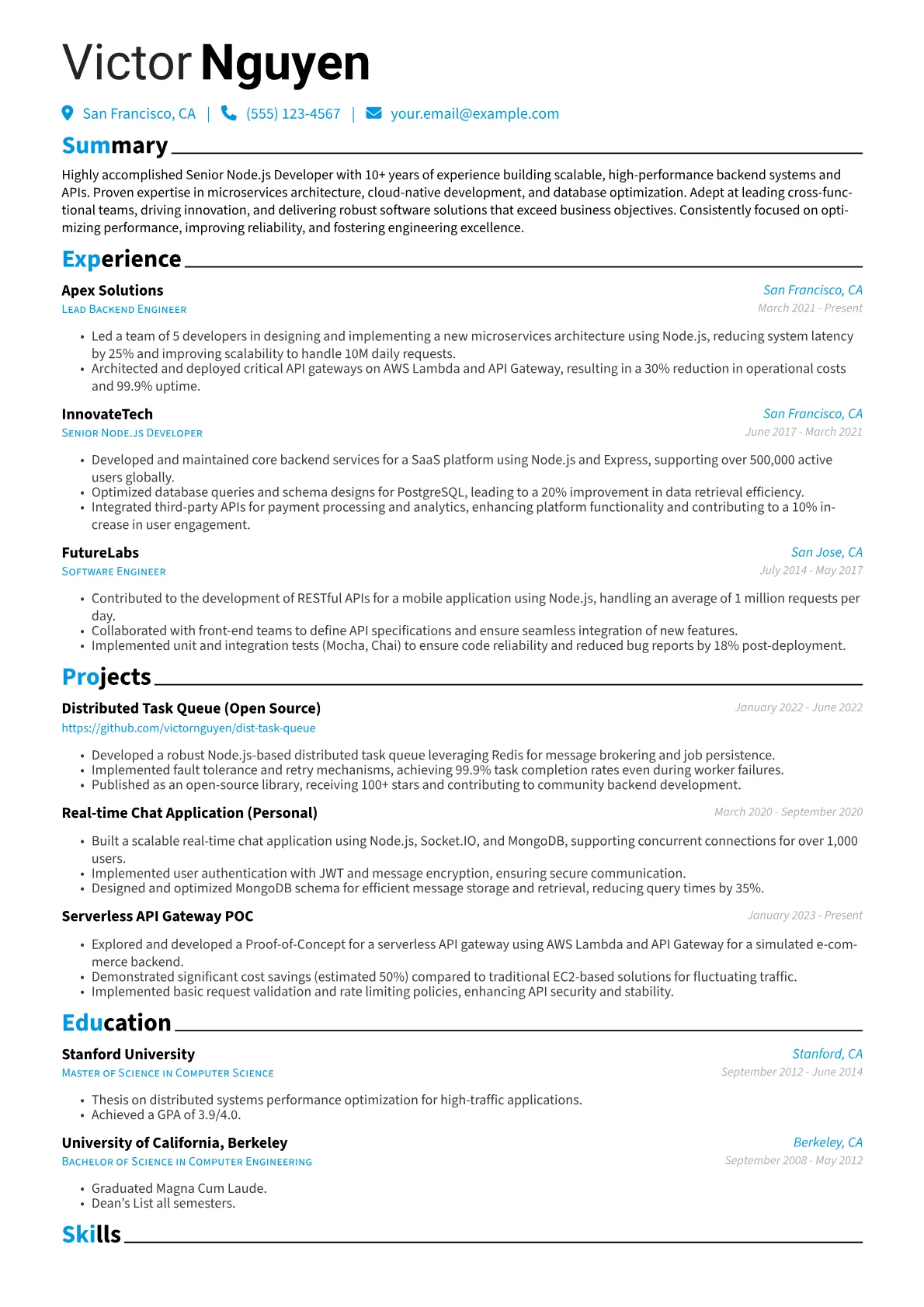 This template was built with JobSprout and can be remixed to create your own tailored Senior Node.js Developer resume. Its clear, outcome-focused design helps showcase your senior-level contributions effectively.