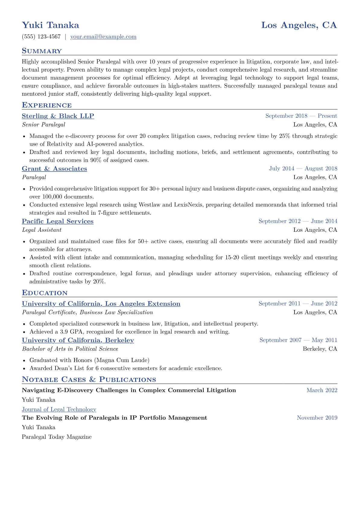 A compelling Senior Paralegal resume in the Legal industry must articulate more than just tasks; it needs to highlight substantive contributions and leadership. Hiring managers seek evidence of sophisticated legal research, advanced e-discovery management, and direct involvement in high-stakes litigation or intricate transactional closings. Key achievements should quantify impact, such as supporting multi-million dollar mergers, reducing compliance risks, or efficiently managing extensive discovery phases. Mentioning specific legal specializations like corporate governance, intellectual property, or complex real estate transactions, alongside certifications like NALA CP or NFPA RP, signals a deep understanding of the legal landscape.